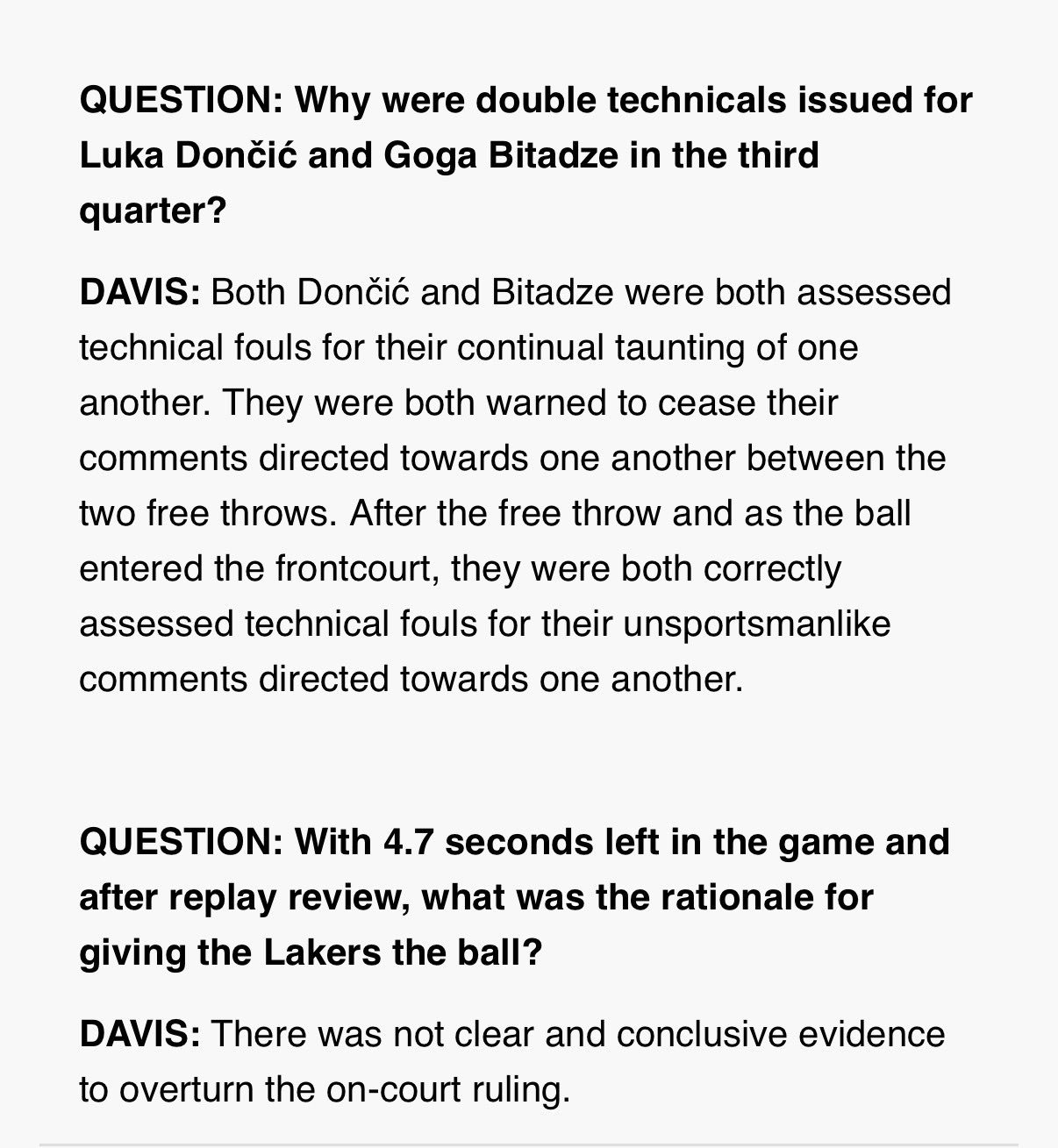戴维斯(裁判代表):东契奇与比塔泽二人因持续互相挑衅,均被吹罚技术犯规。在两次罚球间隙,裁判已警告过他们停止针对彼此的言语冲突。罚球结束后、球推进至前场时,二人因继续发表不文明的对喷言论,被依规吹罚技术犯规。
