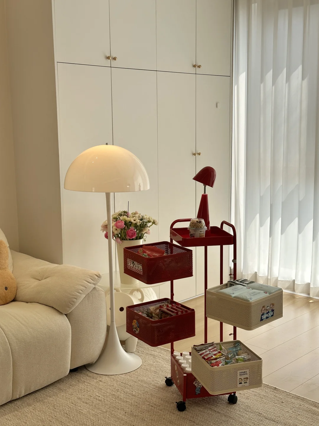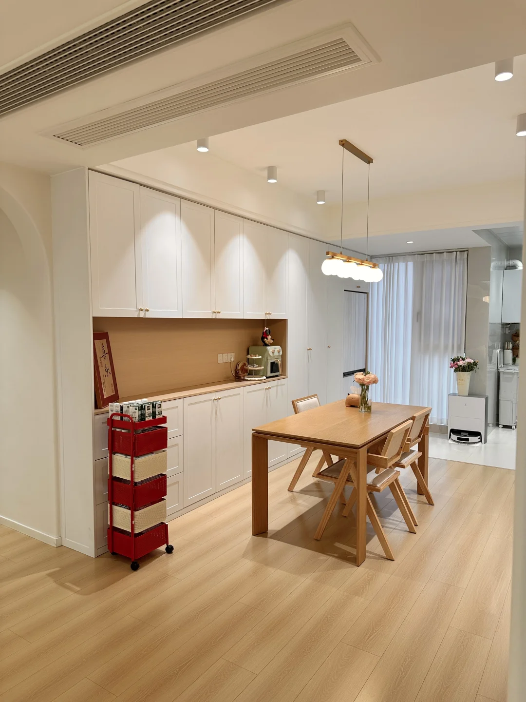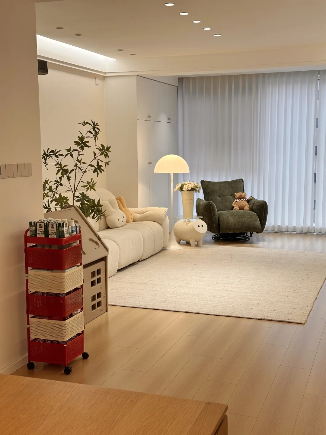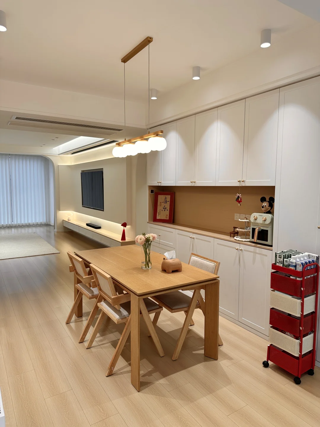 一家三口在小县城过着慢生活,家虽然不大,但装修的足够温馨了,极简原木风,木地板通铺,无主灯明亮又很有氛围感~ 软装根据生活需求慢慢地在添置,最近入手了弗林斯红白小推车,红白撞色放在家里特别亮眼,五层抽屉,分层摆放各种小零食,摆放整齐,底部带滑轮,追剧时推到沙发旁边,推到餐桌旁就是一个超方便的餐边收纳,小小一个不占地,还超能装~