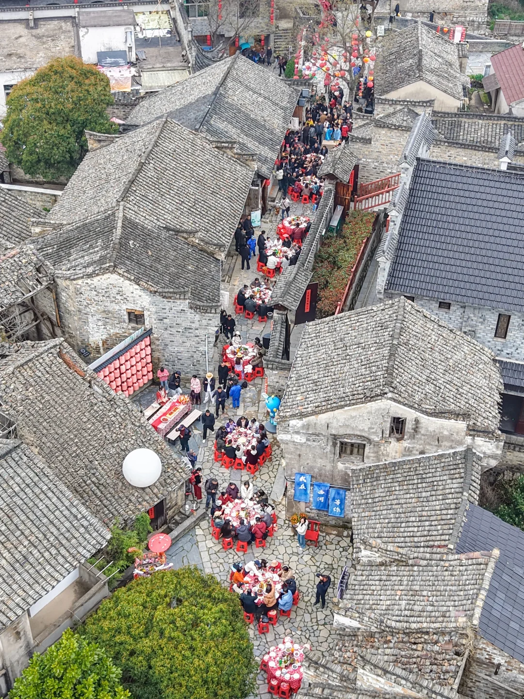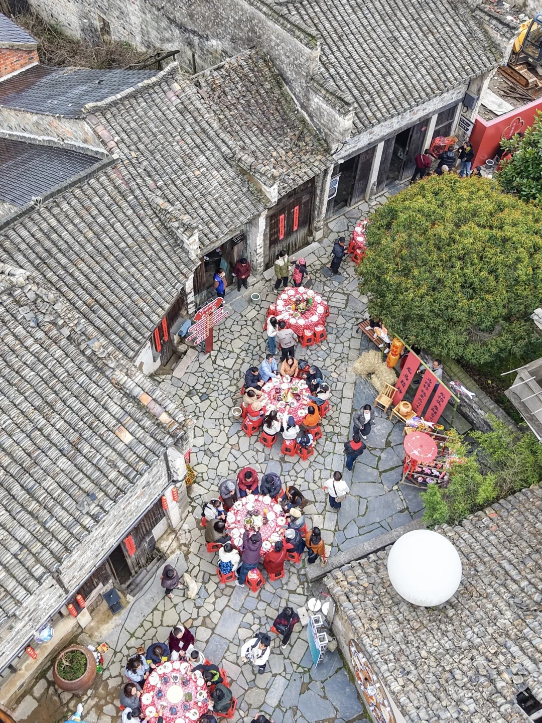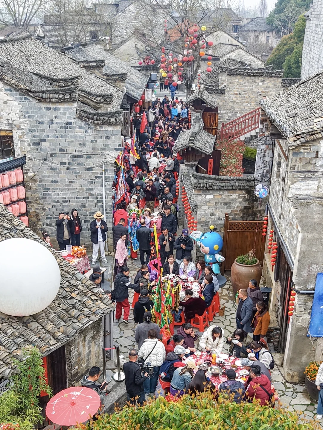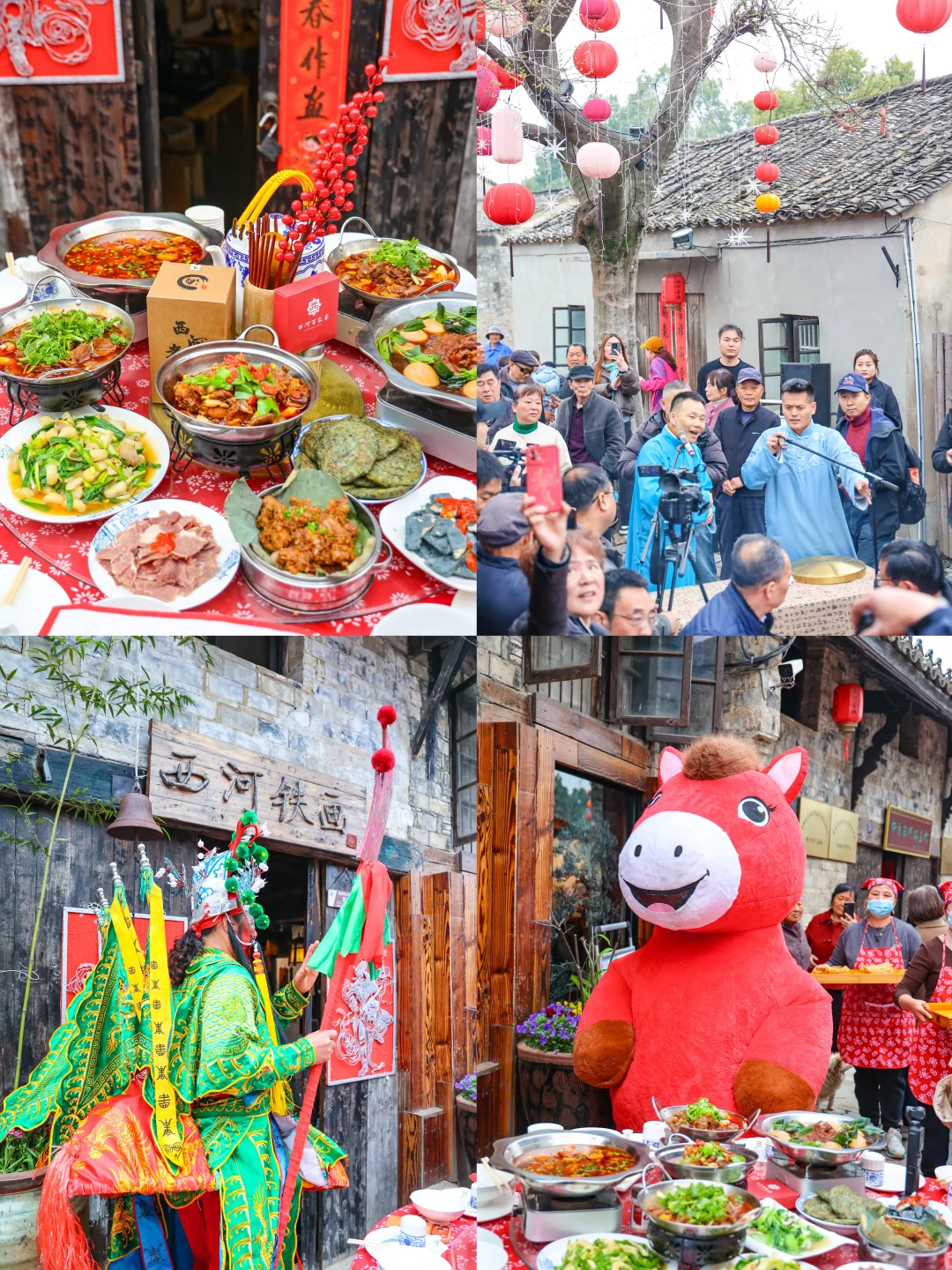 中午在青石老街上开席,圆桌摆了一长溜。不仅能吃到本地乡厨做地道美食,西河蹄髈、荷叶粉蒸肉、阿五牛脯……还有很多表演可以边吃边看!