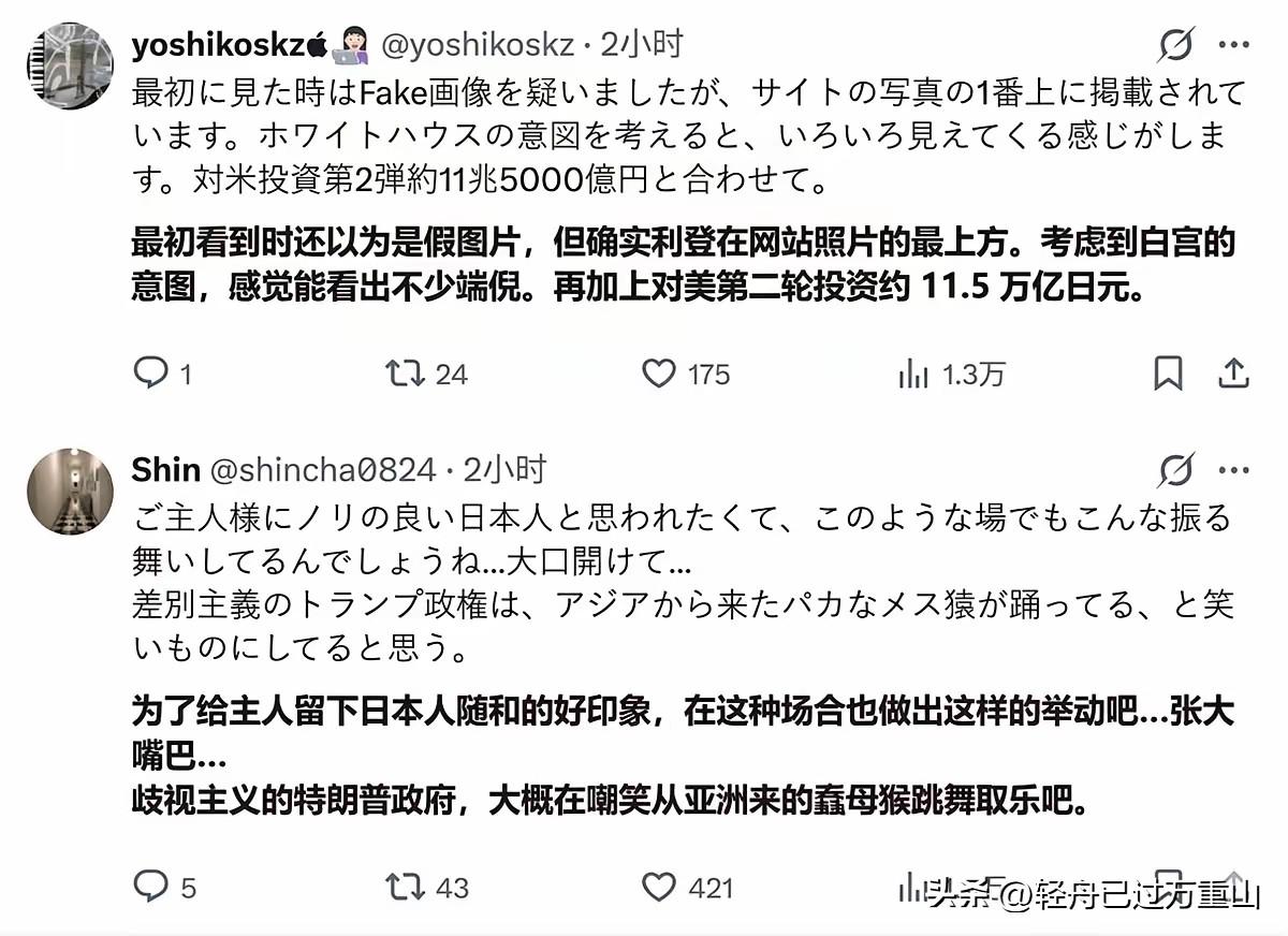 这是高市早苗见到特朗普的举动,简直就像粉丝见到偶像那种夸赞,手舞足蹈的,连日本人道夫评论“有失国格”,还有日本人直言:“这不是外交,这是赤裸裸的谄媚。”有日本网友评论:“看到她这副样子,我作为一个日本人都抬不起头。” 3月20日,白宫发出一组照片,日本网友看完都惊呆了,最后忍不住吐槽首相,因为整个过程高市早苗都表现的卑躬屈膝,记者会上,特朗普公然以日本偷袭珍珠港戏谑,称日本最懂“偷袭”,现场气氛极度尴尬,高市早苗只能强装镇定、无言以对,尽显外交被动。 参观白宫时,她面对特朗普肖像做出夸张崇拜神情,张大嘴巴,好像非常激动,但是对拜登相关画像则态度轻慢,被批刻意逢迎、缺乏尊重。晚宴环节,她屈膝示谢、贴脸谄媚,举止轻浮,全无国家首脑应有的庄重与分寸 高市早苗从对着特朗普肖像张大嘴崇拜,到宴会上失态狂欢,每一个动作都在透支日本的国际形象。当一国首相把“讨好美国”当成政绩,当民众在屏幕前为这种姿态感到羞耻,所谓的“外交胜利”,不过是一场让全世界看笑话的闹剧。 高市早苗称特朗普是唯一一个能给世界带来和平与繁荣的人,会见时,当特朗普对她的到来表示欢迎时,一旁都高市早苗不断瞪眼微笑,最后还屈膝表达谢意,她的一言一行都让日本网友极不舒服。 有网友看到照片后评论:“最初看到时还以为是假照片时,但确实刊登在网站照片的最上端。考虑到是白宫的意图,感觉能看出不少端倪。再加上最美第二轮投资约11.5万亿元。” 有网友看不下去了,恶评:“为了给主人留下日本人随和的好形象,在这种场合也做出这样的举动吧张大嘴巴……主人面前,歧视主义的特朗普政府,大概在嘲笑从亚洲来的蠢母后跳舞取了吧!”