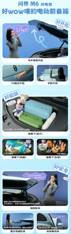 问界M6作为鸿蒙智行2026年推出的新锐智慧SUV,凭借副驾灵感橱窗设计和三重防夹前备箱两大创新功能引发热议,定位25-30万元级年轻市场,计划于3月23日开启预订。 一、核心创新设计:副驾灵感橱窗 个性化展示与模块化拓展 潮玩安全展区:副驾前方三角窗区域设计为可拆卸钢化玻璃橱窗,支持磁吸固定盲盒、手办等个性化藏品,内置256色氛围灯并支持音乐律动同步。 多功能模块切换:用户可替换为墨彩相册模块(通过NFC一碰传图展示电子照片)、光影香薰模块(香氛+灯光联动),或外接Pad支架等拓展配件。 安全与交互设计 车规级安全保障:橱窗玻璃采用与前挡风玻璃同材质的防爆钢化玻璃,碰撞时仅裂纹不飞溅;结构完全避让安全气囊弹出路径,并通过锁止装置固定模块。 智能控制:支持手机App远程调节灯光模式,一键切换“避光模式”隐藏内容,兼顾私密性。 全车磁吸生态协同 全车配备10处磁吸点,覆盖B柱、座椅靠背、中控台下沿等区域: 磁吸配件:灵活吸附纸巾盒、垃圾桶、阅读灯、破窗锤等配件,解决零散物品收纳痛点; 智控旋钮(EasyKit):自定义调节音量、空调温度或切换驾驶模式,吸附位置可自由选择。 二、前备箱:实用性与安全双重突破 超大容量与人性化细节 202L规整空间:纯电两驱版实测可容纳24寸+20寸双行李箱,侧边仍有余量存放背包或杂物;场景适配设计:底部配备排水孔(冲洗户外装备)、双侧挂钩(挂外卖防洒漏)、内嵌LED照明灯(夜间取物)。 三重防夹安全机制 视觉感知防夹:侧向摄像头实时监测高危区域,识别人体立即暂停关闭并语音提醒; 霍尔传感器防夹:闭合遇阻自动回弹; 压力防夹条:触碰即触发反向弹开,覆盖机械结构盲区。 实测中,博主甚至用头部测试防夹有效性,验证其可靠性。 8种智能开启方式 支持敲击(KK开启)、手势识别、车外语音、手机App远程等,满足无接触操作需求。 三、基础信息与市场定位 关键参数 尺寸:4960×1985×1736mm(轴距2950mm),定位中大型SUV; 续航:纯电版CLTC续航760km(100度电池),增程版综合续航超1400km; 智驾:全系搭载华为乾崑ADS 4.0系统,配备896线激光雷达。 年轻化策略 七色情感化命名:如“财富紫由”(紫色)、“人间青醒”(青色)、“薪响仕橙”(橙色),通过谐音梗传递情绪价值; 紫慕白运动内饰:一体式桶形座椅+D型方向盘,强化动感风格。
