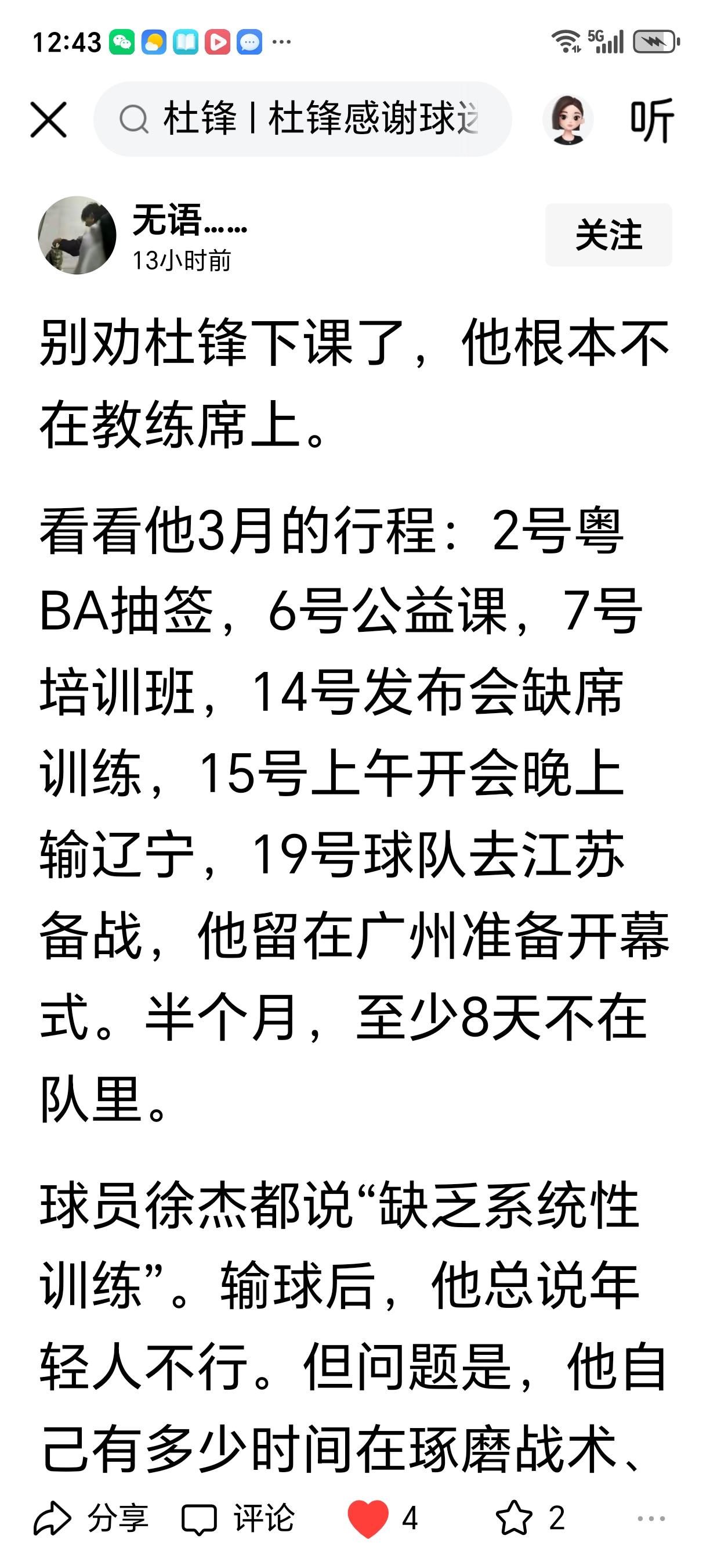 今晚广东宏远客场打上海久事,无论胜负都不再喷杜锋。 以刷到喷杜锋的文章不再阅读点赞加评论,为什么呢? 一、因为刷到图③辽宁自媒体人的发文,杜锋这忙的在广东宏远俱乐部的时间极少,他更多的时间在忙广东篮球的各种事项。 二、中国足协乱作为时江苏创办了苏超,那是江苏人民自己的足球联赛,也是江苏普通人民的联赛,网上说办得很好、影响力很大,以后江苏的足球人才肯定会涌现很多。 三、中国篮协、CBA公司近些年也遭很多球迷诟病,CBA联赛影响力不増反降,对国内人才培养也不友好,能打上CBA联赛的人也是几凤毛麟角,根本就不是普通人的运动。广西球员庞峥麟不也是从低级别的蓝球比赛中培养出来的吗? 四、现在杜锋牵头创办粤BA联赛才是真正广东人民自己的联赛,我们应该感谢他运用影响力和能力先把粤BA联赛搞起来,有了广东省自己的联赛,还用怕广东没几个打CBA联赛的人吗?人才的涌现不会超过十几、二十年,群众基础好了广东的三个俱乐部才能长期经营好,广东宏远也是受益者。 五、CBA联赛的门票也不是普通老百姓可以接受的,特别是广东宏远俱乐部的门票,珠三角的人民是富裕很多,他们可以享受得起,其他地区的人民可不一定能消费得起,现在的粤BA联赛据说门票8.8元这对普通人来说就没有压力了!群众的热情上来之后会带动更多的人参与篮球运动。 今晚广东宏远VS上海久事CBA联赛粤BA联赛杜锋CBA联赛球谜广东球迷广东宏远俱乐部球迷 (图片来自于网络)