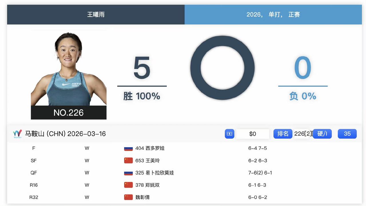 ITF马鞍山W35赛,王曦雨复出第一站即未丢一盘连胜5场,拿下冠军。即时排名升至