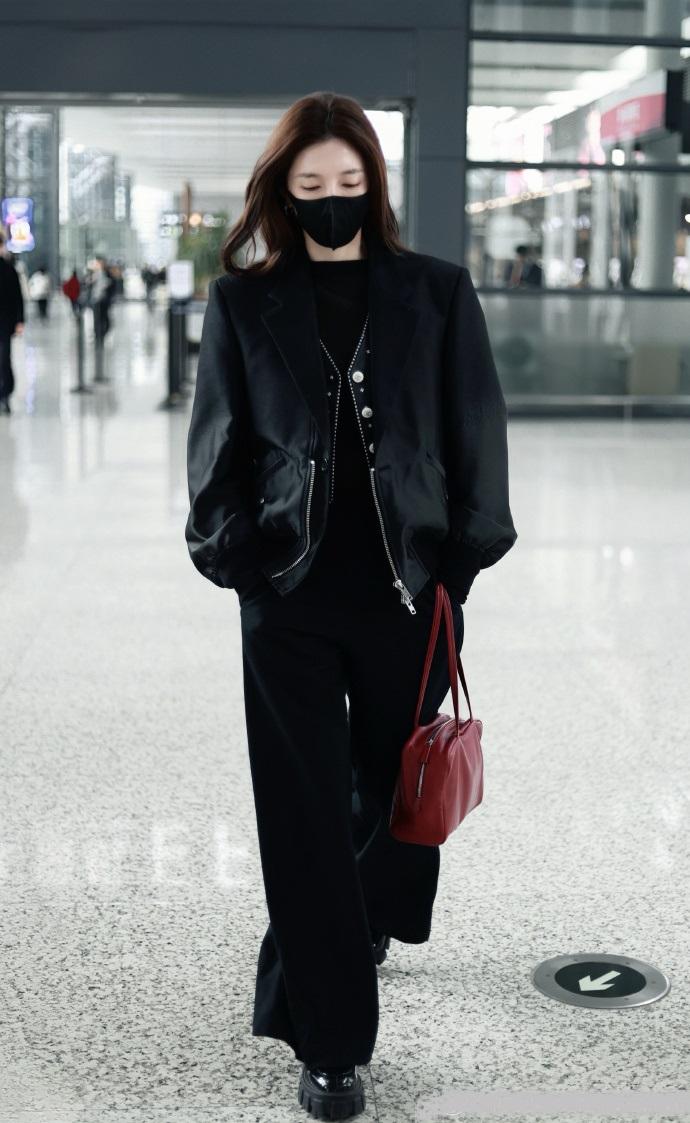 最近江疏影现身机场的时候搭配了一身黑色的衣服,看起来潇洒又迷人。 江疏影里面穿黑色打底衫,外面套着黑色的外套,两件衣服叠穿起来显得很有层次感。 她下身穿黑色的阔腿裤,凸显出了洒脱之美,看上去也很有随性之美。 江疏影真的是越来越苗条了,所以搭配宽松的服饰也很有吸引力,还格外的有国际大牌明星风采。 她留着超美的披肩长发,戴着黑色的口罩,展现出了满满的浪漫感,整体效果极为出众。江疏影还留着红色的包包,气质超好。