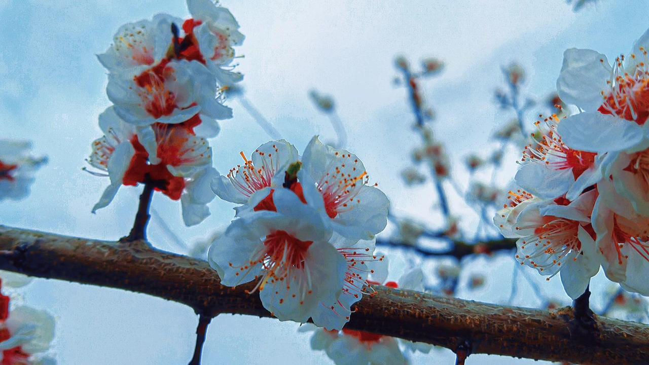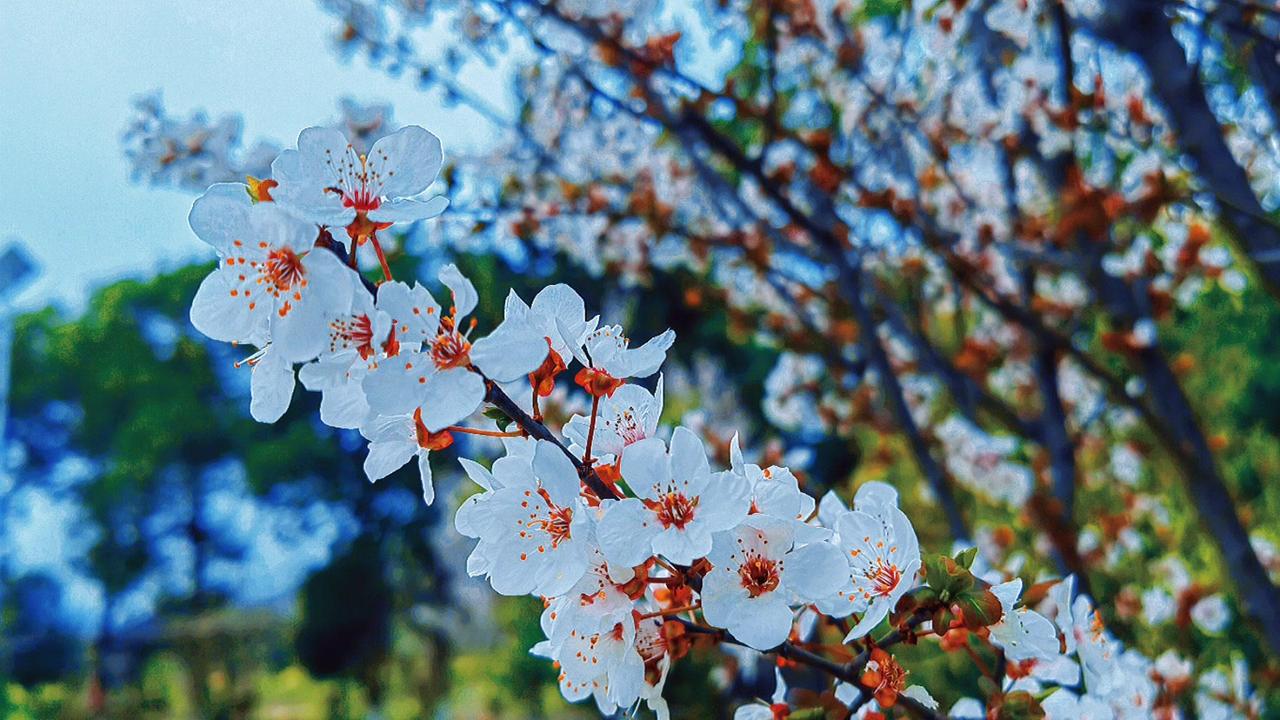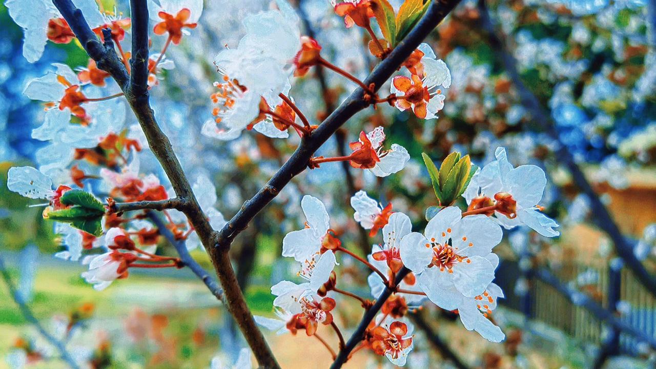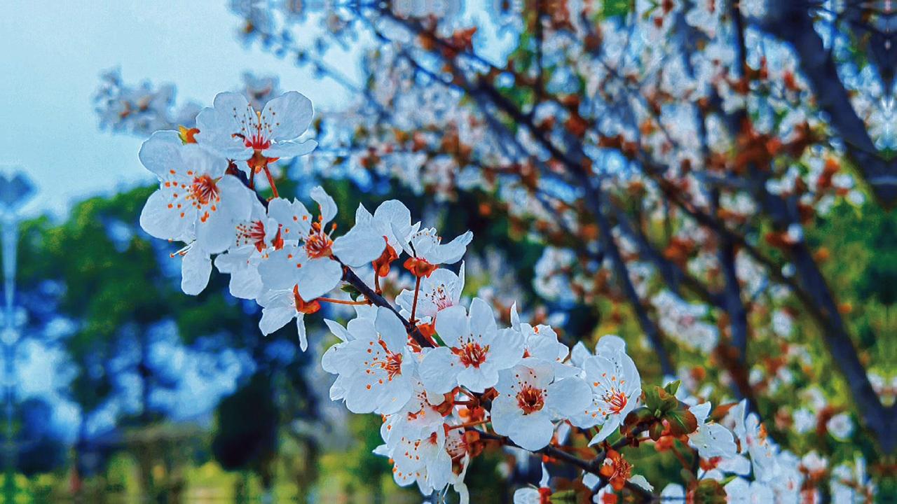 紫叶李开花时,每一瓣都薄得透光,连阳光都小心翼翼地穿过,仿佛怕惊扰了这半透明的梦。最动人的是那花蕊——一点鲜红,如朱砂,如心尖血,在素白里燃着。风来时,花瓣微微颤动,像极了欲言又止的心事。 这春日的私语,你听见了吗?