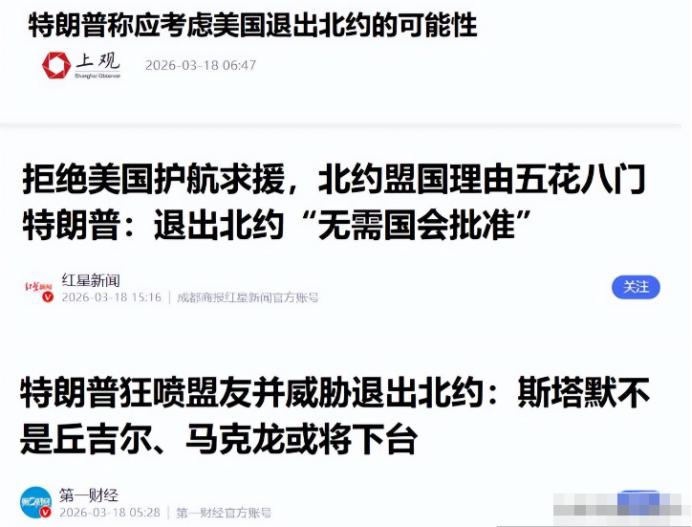 特朗普威胁退出北约,英国不惯着!不到48小时英国对美下达逐客令 当地时间3月17日,美国特朗普在公开讲话中再度放飞自我,对着北约盟友一顿炮轰,语气里满是不耐烦与威胁。他直言不讳地抱怨北约盟友支持不足,甚至放话称,若成员国不协助美国“重新打通霍尔木兹海峡”,北约将面临“非常糟糕的未来”,退出北约更是“值得认真考虑”的选项。 很多人可能觉得特朗普又在说大话,毕竟他向来爱用“退群”威胁盟友。但这次不一样,他的表态里藏着实打实的施压,绝非随口发泄。 特朗普心里打得算盘很清楚。美国在伊朗发动军事行动后,霍尔木兹海峡的航运受阻,国际油价一路飙升,美国自身也面临不小的军事和经济压力。他想把这种压力转嫁给北约盟友,让欧洲国家帮着分摊风险和成本。 他反复强调,欧洲是霍尔木兹海峡通航的主要受益方,理应出手协助美国打通海峡。这话听着冠冕堂皇,本质就是想让盟友替美国“火中取栗”,自己坐收渔利。 更离谱的是,特朗普还拿退出北约当筹码,甚至放话说退出北约“无需国会批准”。要知道,美国国会早就通过法律,限制总统单方面退出北约,这项决定必须获得参议院三分之二同意才行。他这话,既是说给盟友听的,也是说给国内选民听的,想靠这种强硬姿态刷支持率。 特朗普本以为,凭着美国在北约的主导地位,盟友们肯定会乖乖妥协。毕竟以往每次他施压,盟友们就算不情愿,也会多少让步。可这次,他低估了欧洲国家的决心,尤其是英国的态度。 英国一直被视为美国的“头号盟友”,两国合作多年,以往美国有需求,英国基本都会第一时间响应。但这次,英国没有惯着特朗普的任性。 就在特朗普发表威胁讲话后,不到48小时,英国就做出了强硬回应,相当于直接给美国下了“逐客令”。英国首相斯塔默明确拒绝了特朗普的要求,表态英国会和盟友合作制定恢复霍尔木兹海峡航运的计划,但这绝对不会是北约的任务,更不会让英国军队卷入中东的战事。 英国不光是口头拒绝,还出台了实际限制措施。英国同意美军使用英格兰和迪戈加西亚的军事基地,但明确限制美军利用这些基地开展针对伊朗的攻击行动。这就意味着,美国想借英国的基地扩大对伊军事行动,根本行不通。 可能有人会问,英国为啥突然硬气起来,敢直接跟美国叫板?其实这不是一时冲动,而是英国基于自身利益的理性选择。 霍尔木兹海峡局势复杂,伊朗在该地区部署了大量岸基导弹、无人机和水雷,水域狭窄,舰艇机动受限,参战风险极大。英国很清楚,一旦卷入对伊军事行动,只会给自己带来麻烦,还会拖累国内经济。 而且经过这些年的博弈,欧洲国家的“战略自主”意识越来越强。俄乌冲突后,欧洲虽然在安全上还依赖美国,但也逐渐意识到,不能把自身安全完全绑定在美国身上,尤其是特朗普这种不确定性极强的领导人,随时可能做出损害欧洲利益的决定。 英国的表态,其实也代表了不少北约盟友的心声。此前德国就已经明确回应,这场战争和北约无关,北约是防御性联盟,不会授权部队参与中东战事。法国、意大利等国也纷纷表态,不愿参与美国的护航行动。 特朗普的威胁,不仅没吓到盟友,反而暴露了美欧之间的深层矛盾。以前美欧矛盾主要集中在军费分摊上,特朗普第一任期就反复抱怨欧洲防务支出没达到GDP的2%。现在矛盾升级了,美国不仅要盟友出钱,还要盟友出人出武力,直接参与军事行动,这是欧洲国家无法接受的。 大家也别真以为特朗普会真的退出北约。退出北约不符合美国的核心利益,北约是美国掌控欧洲、制衡对手的重要工具,还是美国军火商的重要市场。一旦退出,美国会失去对欧洲的主导权,还会丢掉巨额军火订单,美国国会、军方和利益集团都不会同意。 特朗普之所以放狠话,本质就是一场谈判施压。他想通过威胁退出北约,迫使盟友妥协,让它们承担更多安全成本。可他没想到,盟友们这次集体硬气,直接戳破了他的把戏。 英国的“逐客令”,更是给特朗普泼了一盆冷水。这也说明,美国的同盟体系早已不是铁板一块,单边主义的号令越来越难以奏效。 后续美欧之间的博弈还会继续,特朗普大概率还会继续施压,但盟友们应该不会轻易妥协。毕竟没有哪个国家愿意牺牲自身利益,去迎合美国的霸权野心。这场围绕霍尔木兹海峡的风波,不仅考验着美欧关系,也在重塑着全球的安全格局。