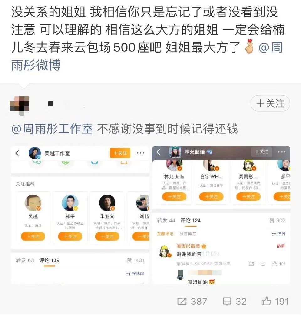 周雨彤给白宇章若楠新剧包场神仙友情!章若楠曾为周雨彤《太平年》包场,如今周雨彤暖心回礼,为白宇、章若楠《冬去春来》送上云包场。误会化解、双向奔赴,用行动诠释真友谊。今晚《冬去春来》开播,一起见证90年代北漂追梦故事,为这份温暖打call!