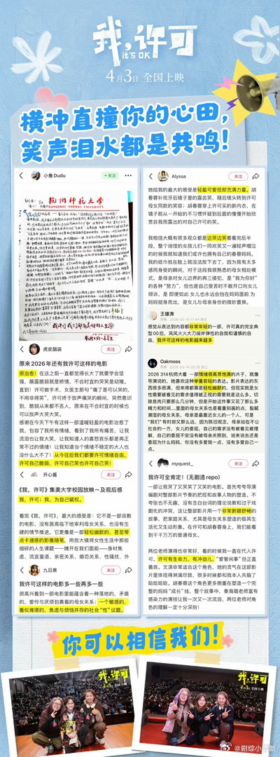 电影我许可首波观众反馈文淇新片我许可点映口碑 点映场反响确实好。有观众说边笑边哭,母女线很戳人。那些平时不太聊的议题,电影里也聊了。敢说敢拍,确实有力量。