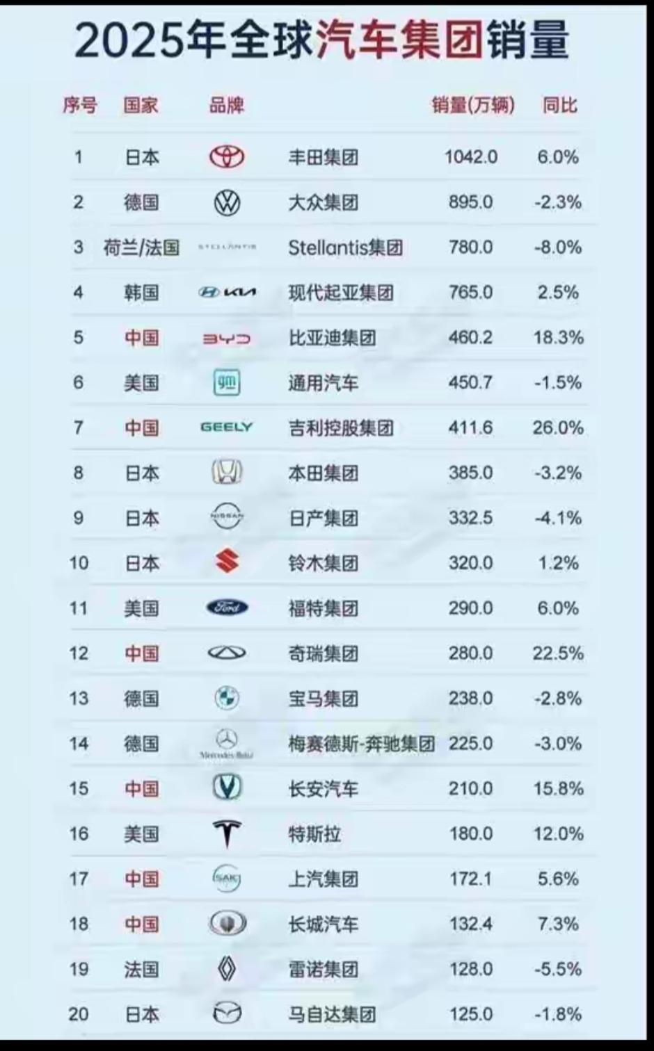据日媒消息,中国首次登上全球汽车总销量榜首,终结日本“25 年连霸”,其中6家中国车企进入全球前20。 曾几何时,日本生产的汽车是中国人高不可攀的奢侈,日本车企更让中国车企望尘莫及!如今一切都变了,我们终于赶上来了,正在努力超越。 中国车企比亚迪、吉利控股、奇瑞、长安、上汽、长城上榜2025年全球汽车销量TOP20。真的让国人扬眉吐气! 相信未来不是梦,中国车企不但已经跑起来,一定还会实现飞起来……