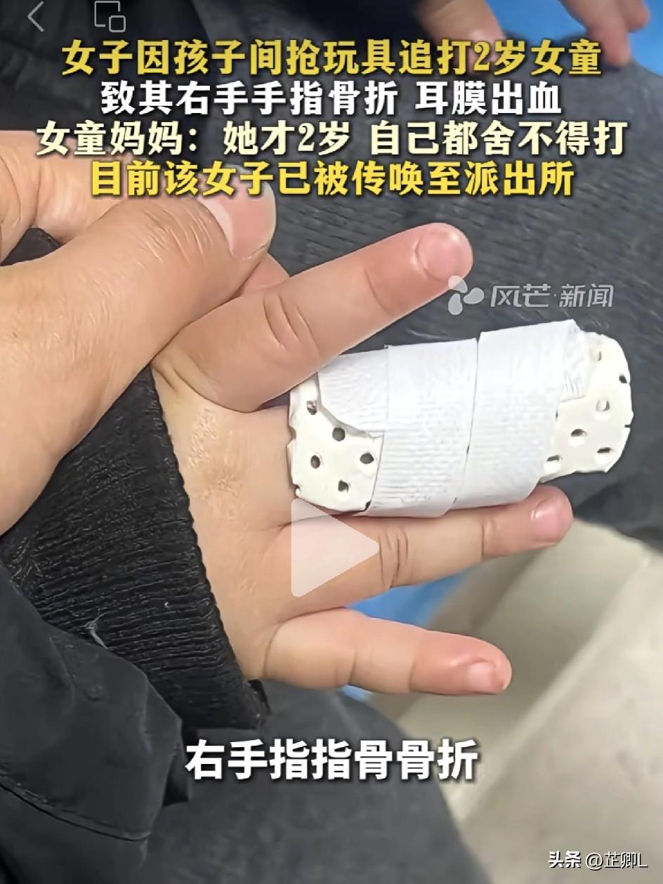 不可理喻!俩孩子抢玩具,安徽宝妈嫌自家娃吃亏,竟致2岁女童手指骨折。孩子母亲:绝不和解! 3月21日,安徽发生一起激起公愤的事件,全网网友看完都气得浑身发抖! 据了解,冲突起因其实很简单:女子的孩子抢了2岁黑衣服女童的玩具车,黑衣女童只是本能护住自己的东西,并没有做错任何事。 结果这个宝妈觉得自己孩子“吃了亏”,瞬间上头,当场抱着自己孩子,对着毫无反抗之力的2岁女童一顿猛打! 视频里,可怜的2岁女童被打得痛哭流涕,手指瞬间红肿变形。随后送往医院检查,耳膜出血,多处软组织挫伤,右手手指直接被打成骨折! 要知道,这可是父母捧在手心都不舍得碰一下的宝贝啊! 得知孩子遭罪,女童的母亲当场崩溃,表示自己连孩子一根手指都舍不得动,却被别人打成了骨折,态度坚决:绝不和解,必须让她付出代价! 视频曝光后,全网沸腾: “这是故意伤害罪必须依法逮捕追究刑责!” “重伤害,还是儿童……必须判刑!” “必须严惩,绝不妥协,绝不和解!” “对幼童施暴,必须依法严惩!” “她自己也有孩子怎么下得去手!” “胡闹,她还是个孩子,你也是个母亲,咋能下了手?” “不和解,必须让她付出代价!” 目前,涉事女子已被警方传唤。 孩子之间抢玩具,有点小打小闹本就是小事,好好劝导就能解决。 可作为一个成年人居然对这么小的孩子痛下重手,彻底触碰了所有人的底线! 更何况,她还是一只手抱着自己的孩子,一只手对别人的孩子下手。当着孩子的面,如此行径,难道就没想过一点点会对自己的孩子造成什么样的心理影响? 这种恶行必须重罚,大家支持严厉追责吗? 素材来源:风芒新闻,侵联删!