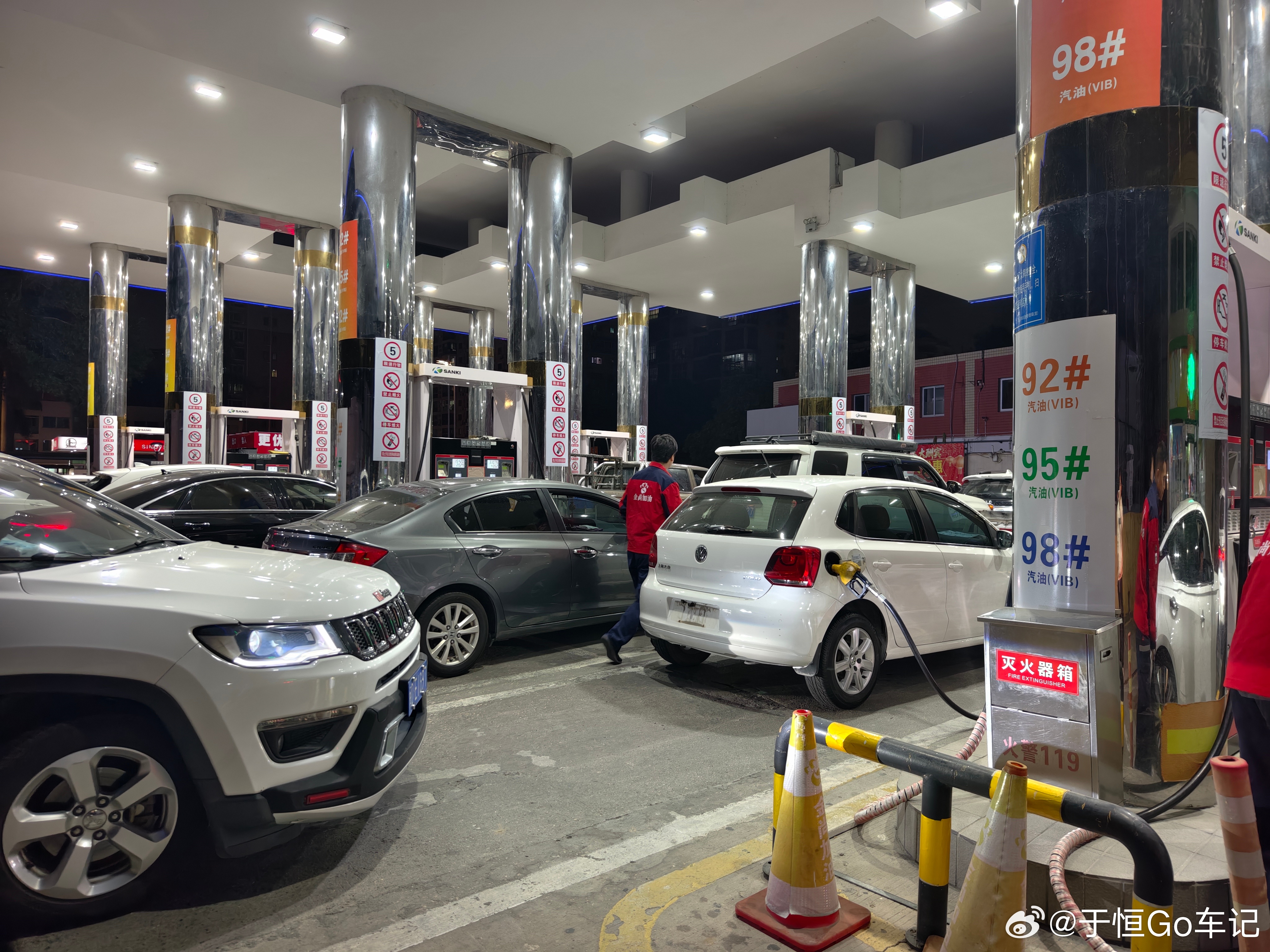 国内油价将迎5连涨 加油站已经开始排队了,赶紧帮梅州的粉丝兄弟吧油加满,不然涨价后他去加又得多花几十块!