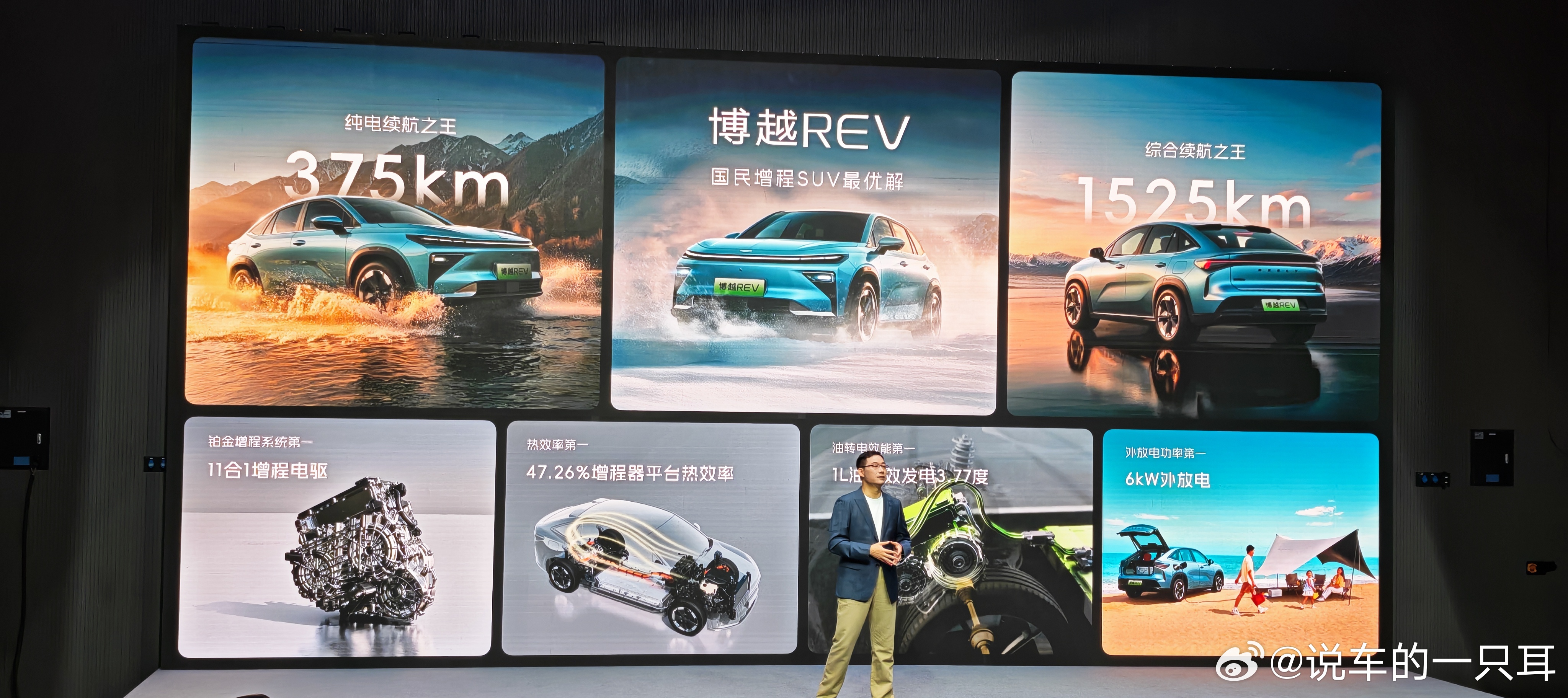 博越REV新车预售发布会预售价12.79万元开启长续航平权A+级增程SUV11合1增程电驱SUV,金砖电池,375km纯电续航,满油满电续航1525km。1l油高效发电3.77度,同级最大外放电功率,6kw。贯穿式前后尾灯,副驾女王座椅。同级独有的FSD可变阻尼悬架。全系标配Flyme auto智能座舱系统。Flyme sound 16个扬声器。博越REV