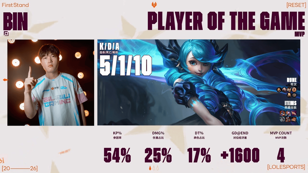 Bin格温砍下5/0/10的战绩,拿下BLG对阵G2次局MVP