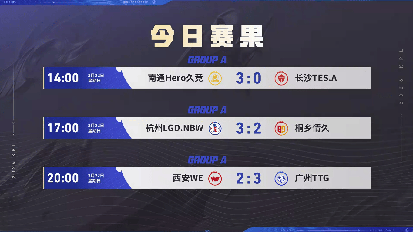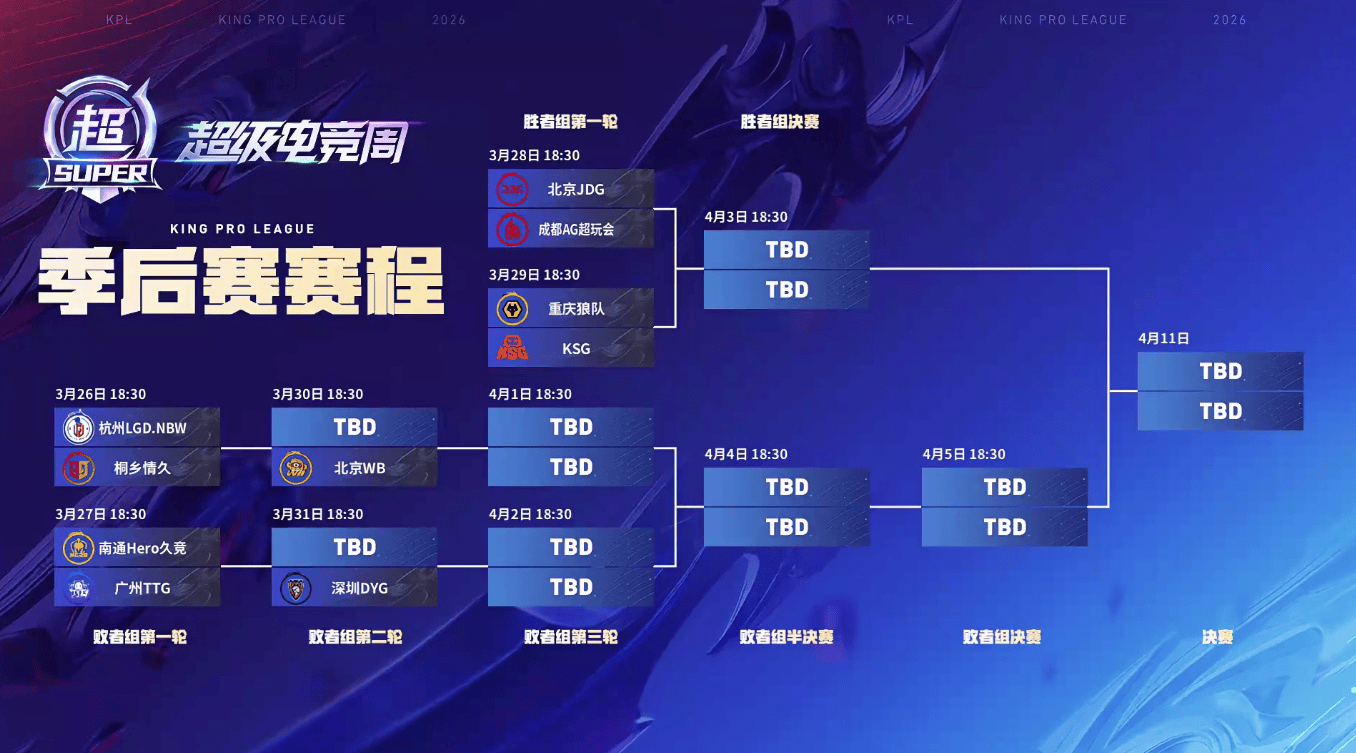 恭喜南通Hero久竞、桐乡情久-王者荣耀、广州TTG确认锁定2026年KPL春季赛季后赛败者组!