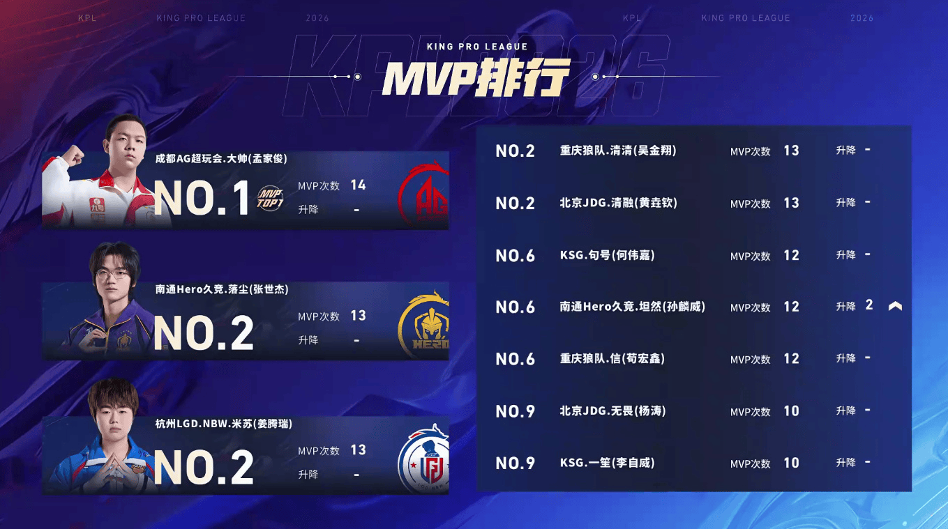 南通Hero久竞_落尘(张世杰)、LGDNBW-米苏(姜腾瑞)、狼队清清-(吴金翔)、JDG清融v(黄垚钦)累计获得13次MVP,并列第二;