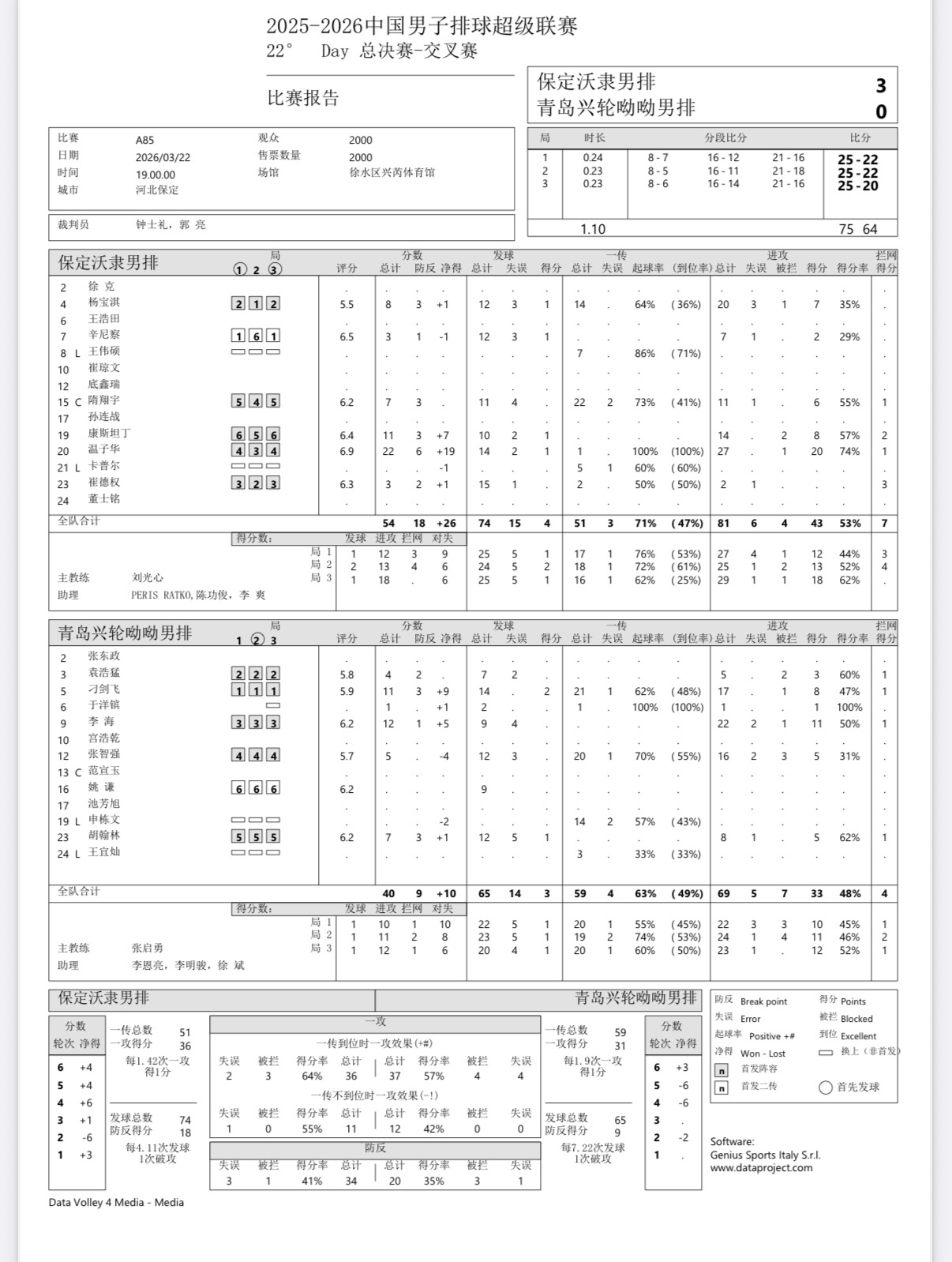 温子华在今天的半决赛中非常高效的砍下22分(27扣20中1被拦,1拦1发),成功率惊人2025-2026中国男排超级联赛
