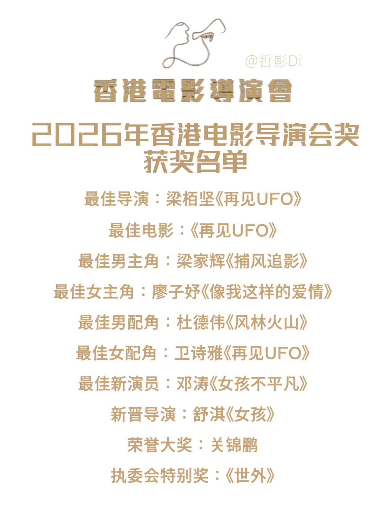 2026香港电影导演会年度颁奖典礼公布获奖名单,影片《再见UFO》获得三项大奖成为最大赢家,梁家辉、廖子妤分别获得本届影帝影后,舒淇则凭借《女孩》获得新晋导演奖。廖子妤已经获得导演会、评论学会两项大奖的影后,金像奖影后应该是没啥悬念了。