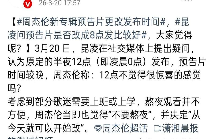 真正让周杰伦改主意的,还得是昆凌。 周杰伦为新专辑《太阳之子》预热,非要在半夜12点发预告,搞得学生党和上班族天天熬大夜。连发三天,粉丝都快扛不住了。 结果昆凌直接拍视频问他:“你干嘛总在半夜发?”,周杰伦还嘴硬说“惊喜感”,旁边杜哥也帮腔,说粉丝太累。昆凌建议,改到晚上8点多好。 周杰伦立马就听进去了,当场拍板“不要熬夜,今天就改!”。当天晚上8点,第四支预告片就准时发了。网友都说,嫂子才是真正的“歌迷代言人”。 这事儿,比发一百句宠粉文案都管用。