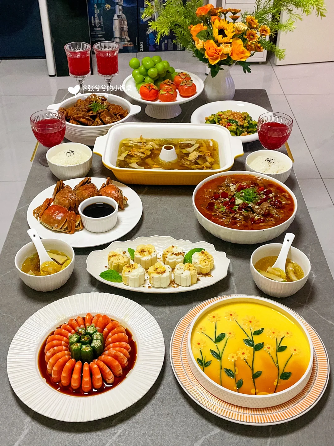2️⃣:清蒸大闸蟹➕松茸鸡汤➕水煮牛肉➕白灼秋葵虾➕酱脊骨➕花朵蒸蛋➕桂花山药➕凉拌黄瓜