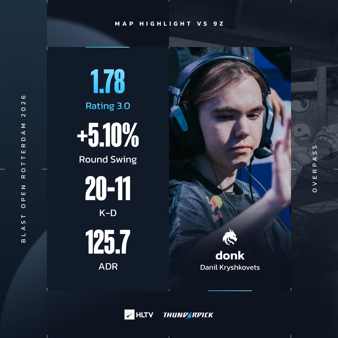 虎扑03月23日讯在刚刚结束的BLAST鹿特丹B组败者组,Spirit对阵9z的图一Overpass中,donk打出统治级表现。他单场拿下1.78Rating、20-11的KD、125.7的ADR以及+5.10%的RoundSwing的恐怖数据,毫无争议地斩获图一MVP,率队先下一城。