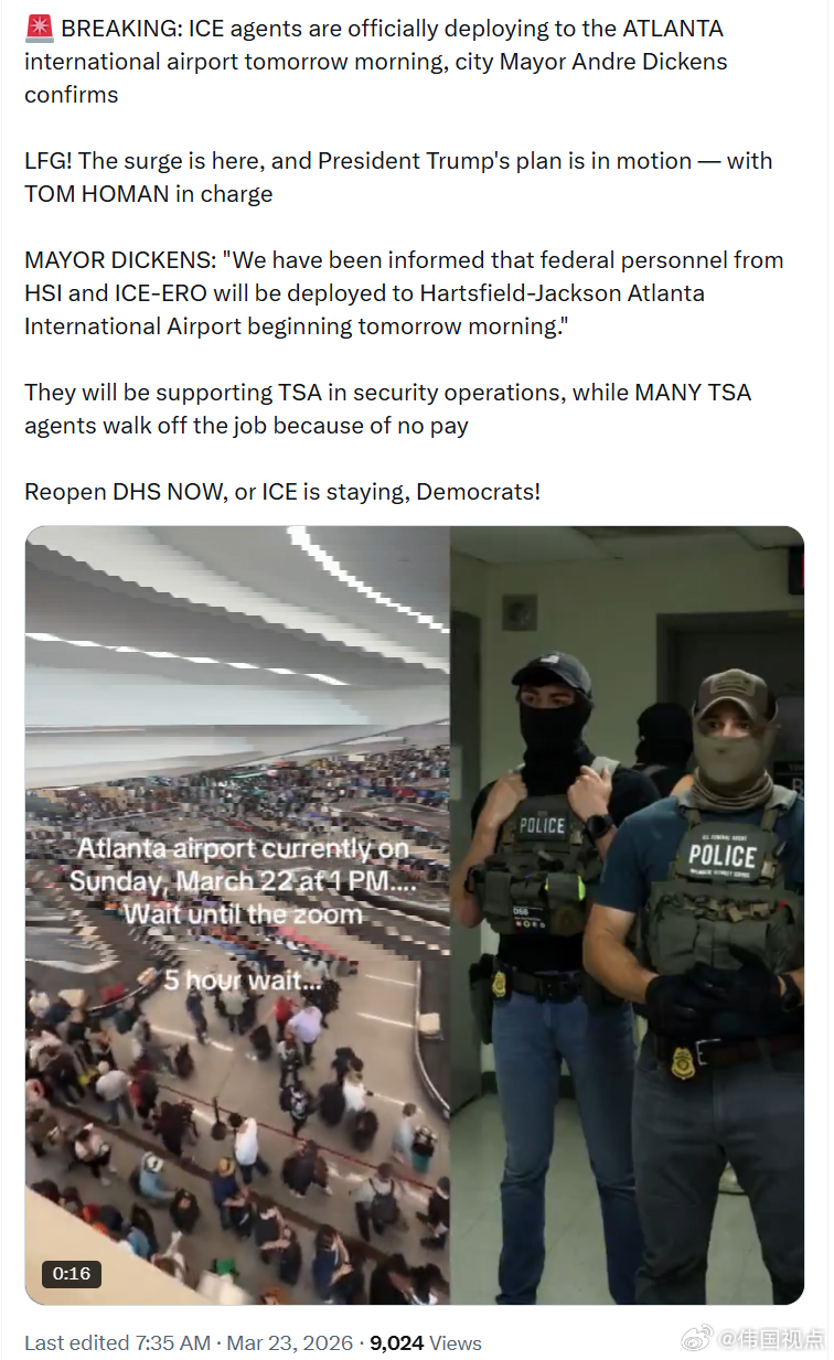 亚特兰大市长安德烈·狄更斯确认,ICE执法人员将于明天早上正式部署到亚特兰大国际机场。