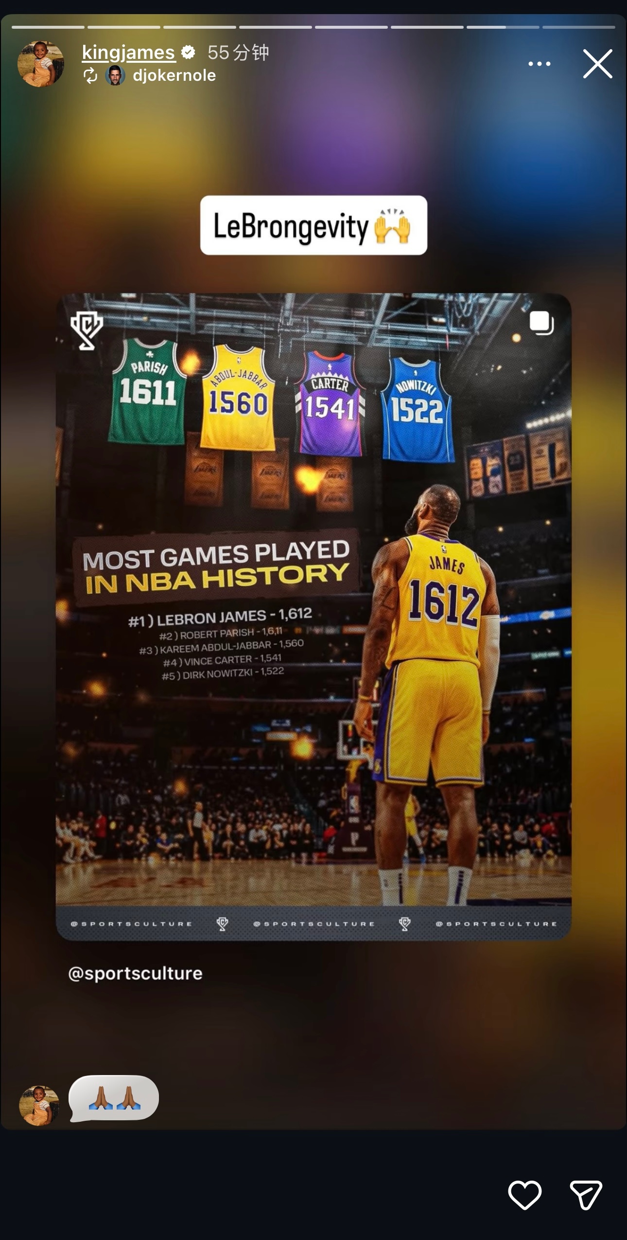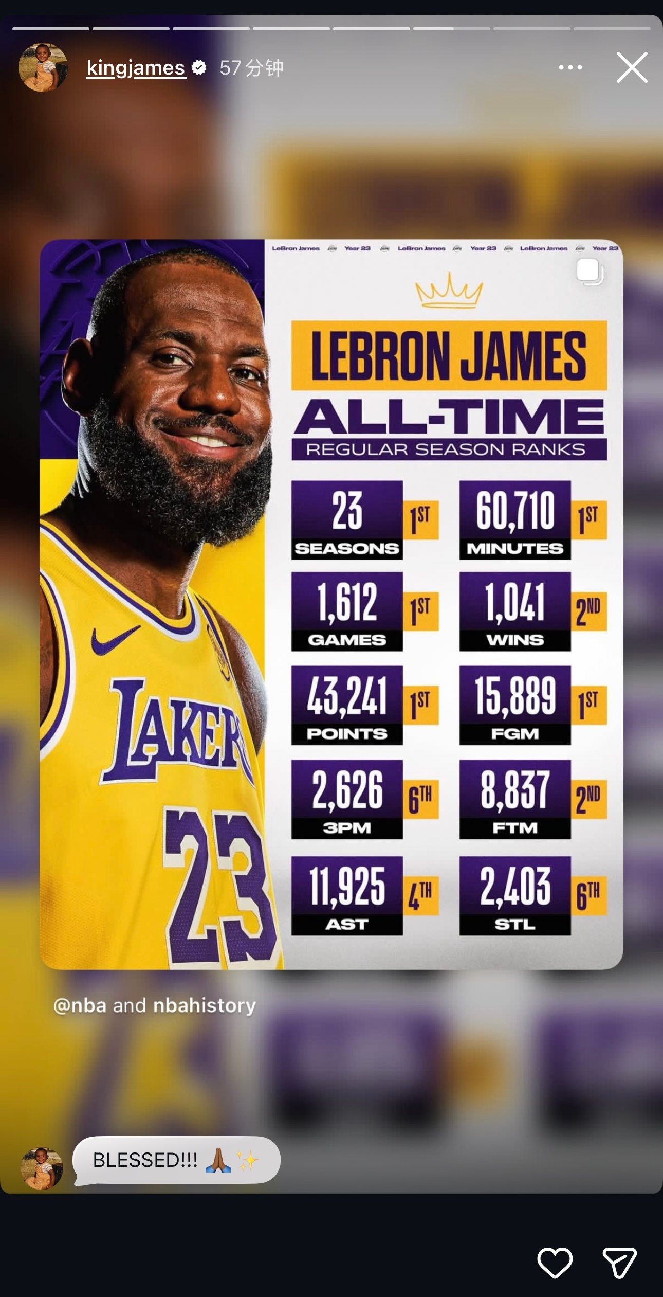 心怀感恩🙏🏾詹姆斯更新动态转发生涯至今所创下的一些纪录和数据。