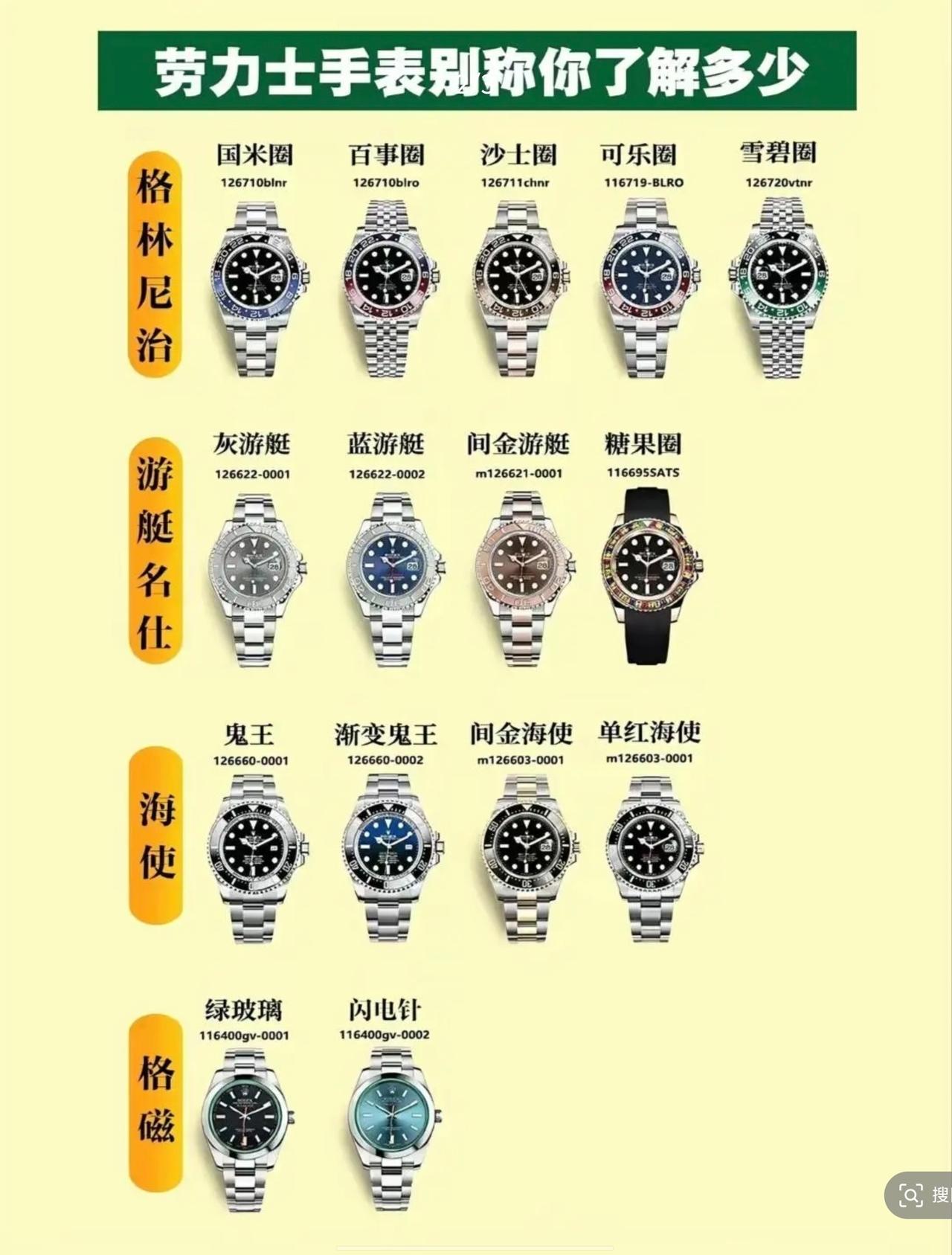 劳力士外号全解析:表友圈的“黑话”。 水鬼家族:黑/绿水鬼、渣男款、无历黑,一眼就能认 迪通拿顶流:熊猫迪、余文乐、彩虹迪、小怪兽,个个是爆款 圈款系列:国米圈、可乐圈、雪碧圈,全靠颜色记名字 颜值担当:冰糖、绿萝、小火龙、蒂芙尼,听着就贵气 这些接地气的外号,比型号好记100倍,你最喜欢哪一款呢?