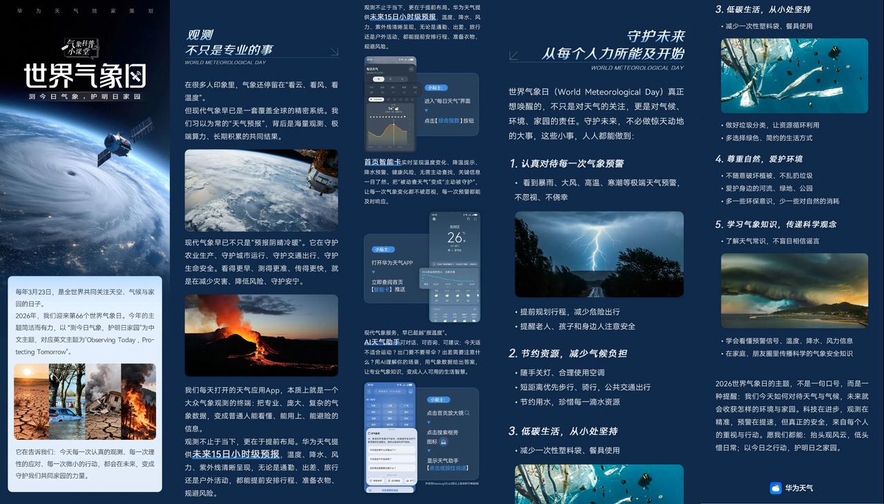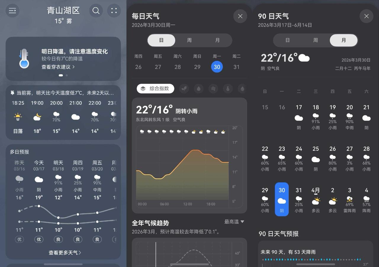 告别春日通勤乱穿衣,华为天气这几个功能太实用了! 南方春天的“善变”,通勤人都懂。前一天暖到穿单衣,第二天倒春寒降温降雨杀个回马枪。跟风骑车上班,半路大风顶得蹬不动。 以前总靠肉眼猜天气频频踩坑,现在用华为天气,通勤路上的小麻烦都能提前规避。 升级到HarmonyOS 6后,大家再去应用市场检查一下华为天气App版本,升级为15.0.14.300。再打开App,从首页右上角的“放大镜”进入“天气助手”。随时随地问一句通勤穿什么,就能收到适配当日天气和通勤场景的穿搭建议+色彩搭配+穿衣技巧等信息,轻松拥有春日OOTD。 早上出发前,首页智能卡实时推送关键提醒。雨天能看到分钟级降雨预报,提前知晓雨势变化。换季降温时会收到降温预警、感冒风险提醒,提前做好保暖防护,躲开倒春寒的偷袭。 遇到出差,点击“多日预报”查看15日小时级预报,出差当天目的地不同时段的温度、降水概率、空气质量等一目了然。在陌生城市也能提前规划,和风雨中的狼狈说拜拜。 作为常年关注华为新品的科技博主,同步个消息——3月23日是世界气象日,同时华为也会下午14:30举办春季全场景新品发布会。重点说下华为畅享90系列,全系预装HarmonyOS 6,上面这些华为天气实用功能完美适配。 平时通勤总被天气拿捏的朋友,建议蹲一波发布会,有机会入手新机解锁更流畅、更便捷的春日通勤气象守护~毕竟关心天气不只是气象工作者的事,咱们普通人用好这些天气工具,日常出门少操点心。 华为天气 华为天气15日小时级预报 HarmonyOS6 世界气象日