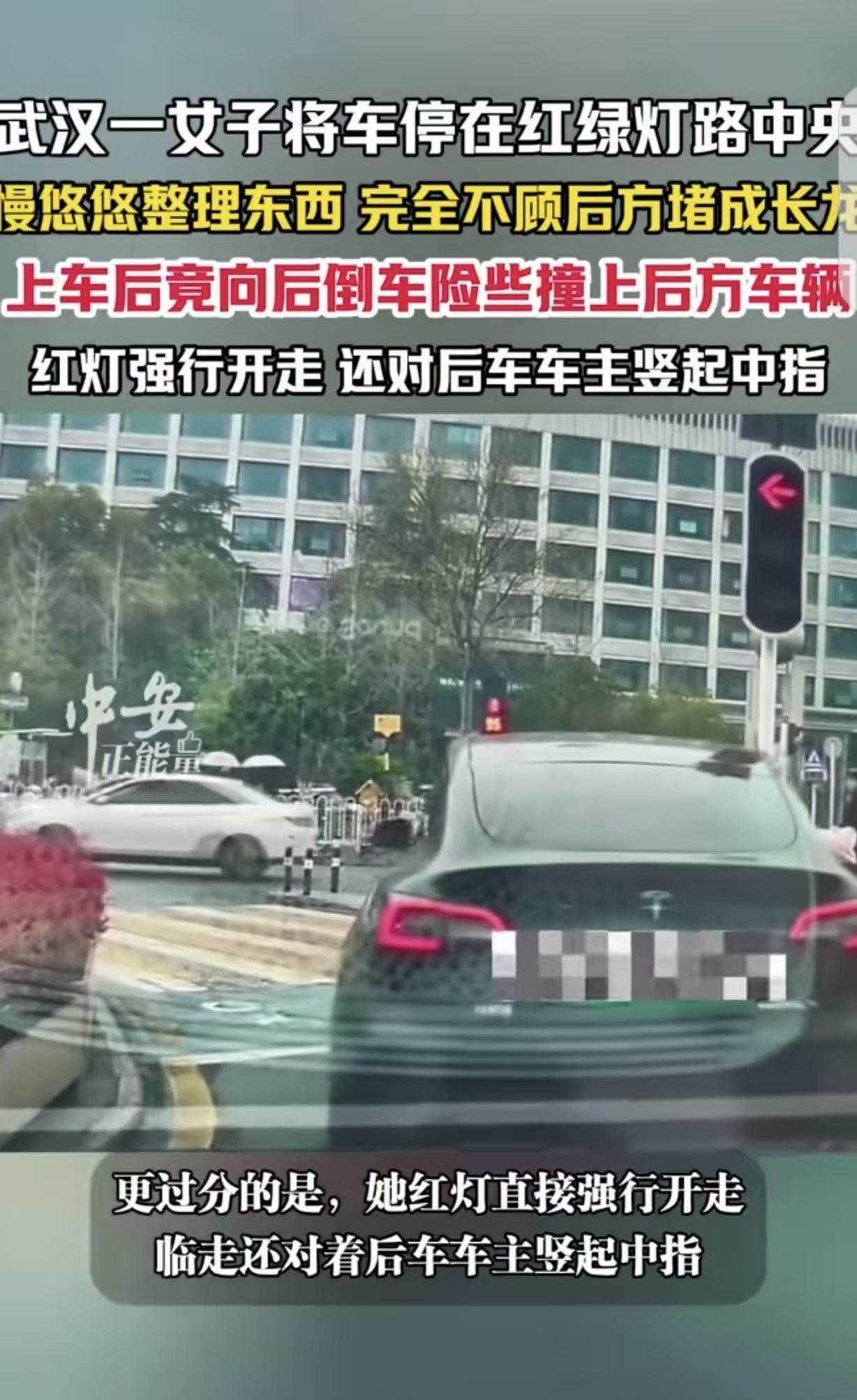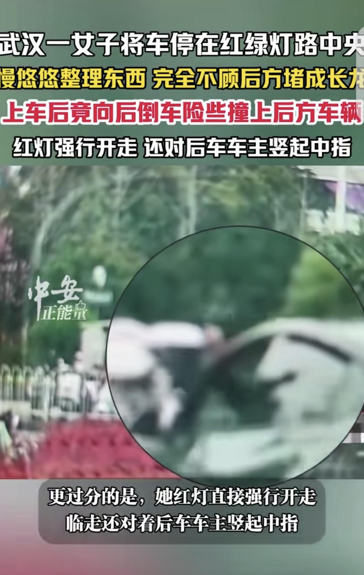 “这个女人是被谁惯的?”湖北武汉,一女子把车停在红绿灯中央,慢悠悠整理后备箱的东西,完全不顾后面堵成“长龙”,上车后,不但往后倒车,差点撞上后面的车子,还红灯强行开走,对后车车主竖中指!网友:一个中指,骂了所有遵守规则的人。 这天,街道上车辆来来往往,大家都按照交通规则有序行驶。 在一个红绿灯路口,绿灯亮起,车辆纷纷启动准备通过。 这时,一辆车却突然停在了红绿灯中央,就像一颗“钉子”扎在了道路的咽喉处。 只见一位女子,不紧不慢地从驾驶座上下来,她打开后备箱,开始慢悠悠地整理里面的东西。 她的动作十分从容,就像周围的一切都与她无关,这里不是公公道路,而是她家的停车场。 可她不知道,自己的这一行为,让后面的车辆瞬间排起了“长龙”,喇叭声此起彼伏,交通陷入了严重的拥堵。 后车司机们一开始还比较耐心,想着她可能很快就会弄好。 可随着时间一分一秒地过去,拥堵情况越来越严重,身后的车辆开始不停地鸣笛提醒,那声音带着愤怒,就像抗议:快点走啊,别耽误大家! 但这位女子却还是我行我素,丝毫没有加快速度的意思。 好不容易,女子整理好了后备箱,慢悠悠地上了车。 大家本以为她会赶紧启动车辆离开,可没想到,她上车后竟然做出了一个让人惊掉下巴的举动。 她开始向后倒车!后面的车辆本来就已经离得很近,她这一倒车,险些就撞上了后方的车辆。 后车司机吓得赶紧猛打方向盘避让,心脏都快跳到嗓子眼儿了。 这还不算完,倒完车后,红灯亮了起来,可这位女子却像是没看到一样,一脚油门直接强行开走了。 更让人气愤的是,在离开的那一刻,她竟然还对着后车车主竖起了中指。 那高高扬起的中指,就像一把刀,刺痛了所有遵守规则的人的心。 网友们看到这一幕后,纷纷表示愤怒。有人说:“这一个中指,骂了所有遵守规则的人! 确实,在公共交通中,规则是保障大家安全、顺畅出行的保障。 而这位女子的行为,不仅严重破坏了交通秩序,还公然挑衅规则,对其他遵守规则的司机极不尊重。 希望这样的事件能给那些无视规则的人敲响警钟,让大家明白,在公共场合,每个人都应该遵守规则,尊重他人,否则,最终受伤的不仅是别人,还有自己。 这种明目张胆的违规,直接吊销驾照,终身禁牌,目无王法,恶意挑衅法律法规应该重罚。 先这样惯着她吧!哪天碰到个脾气暴的,把脸扇肿了,她就不竖中指了。恶人自有恶人磨,嚣张跋扈贯了。在她眼里,整条马路都是她家的。 这女子在公共交通中的所作所为实在恶劣。 交通规则是保障大家出行安全有序的底线,她却肆意践踏,只图自己方便,完全不顾他人权益。 她的嚣张跋扈,不仅破坏了交通秩序,还伤害了遵守规则者的感情。 这种无视规则的行为若不加以严惩,会助长不良风气,让更多人效仿。每个人都应明白,在公共场合,规则不是摆设,只有大家都遵守,社会才能和谐有序。 《道路交通安全法》第99条规定,机动车驾驶人违反道路交通安全法律、法规关于道路通行规定的,处警告或者二十元以上二百元以下罚款。 此案例中,女子在红绿灯中央停车、倒车、闯红灯等行为,严重违反道路通行规定,应依法处罚,以维护交通秩序。 对此,你怎么看? 关注@运良说法 学法律知识不迷路
