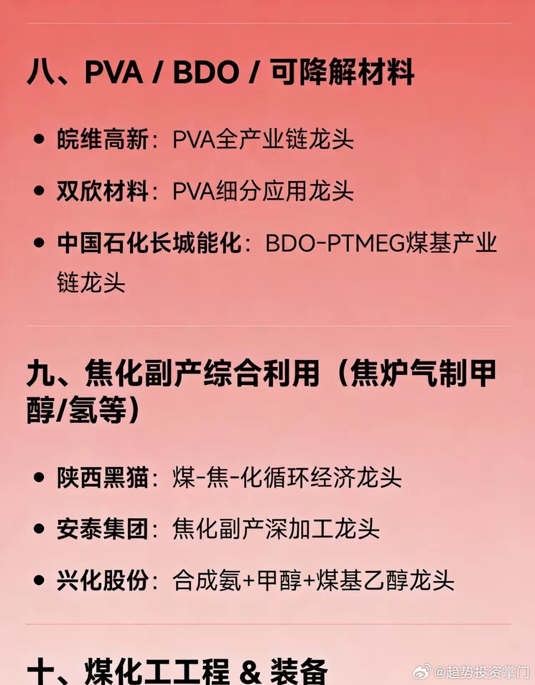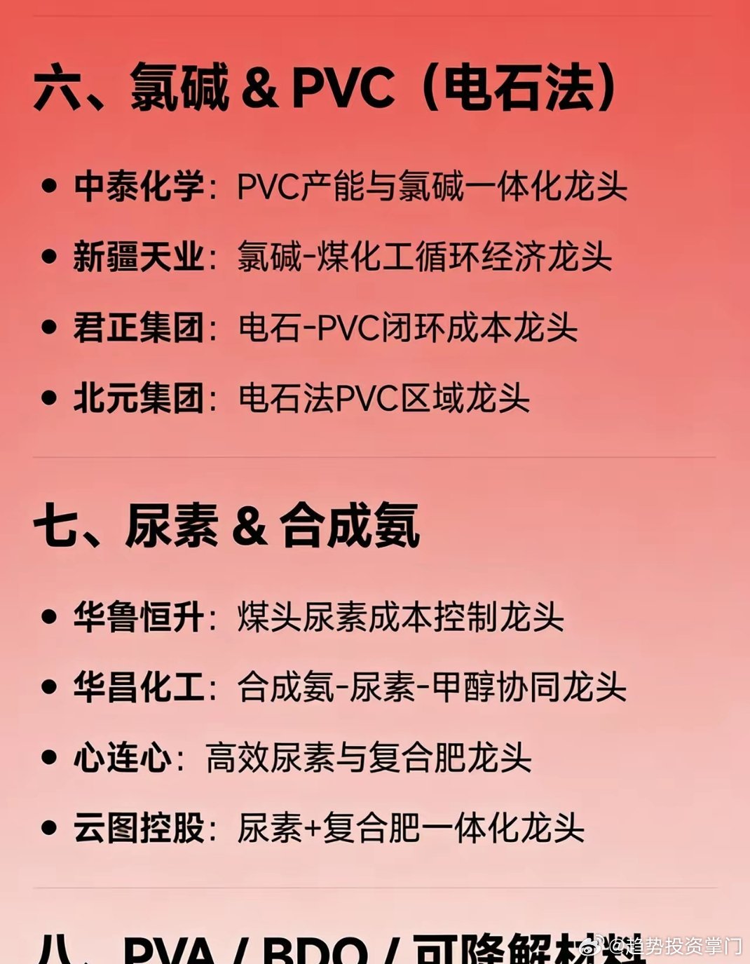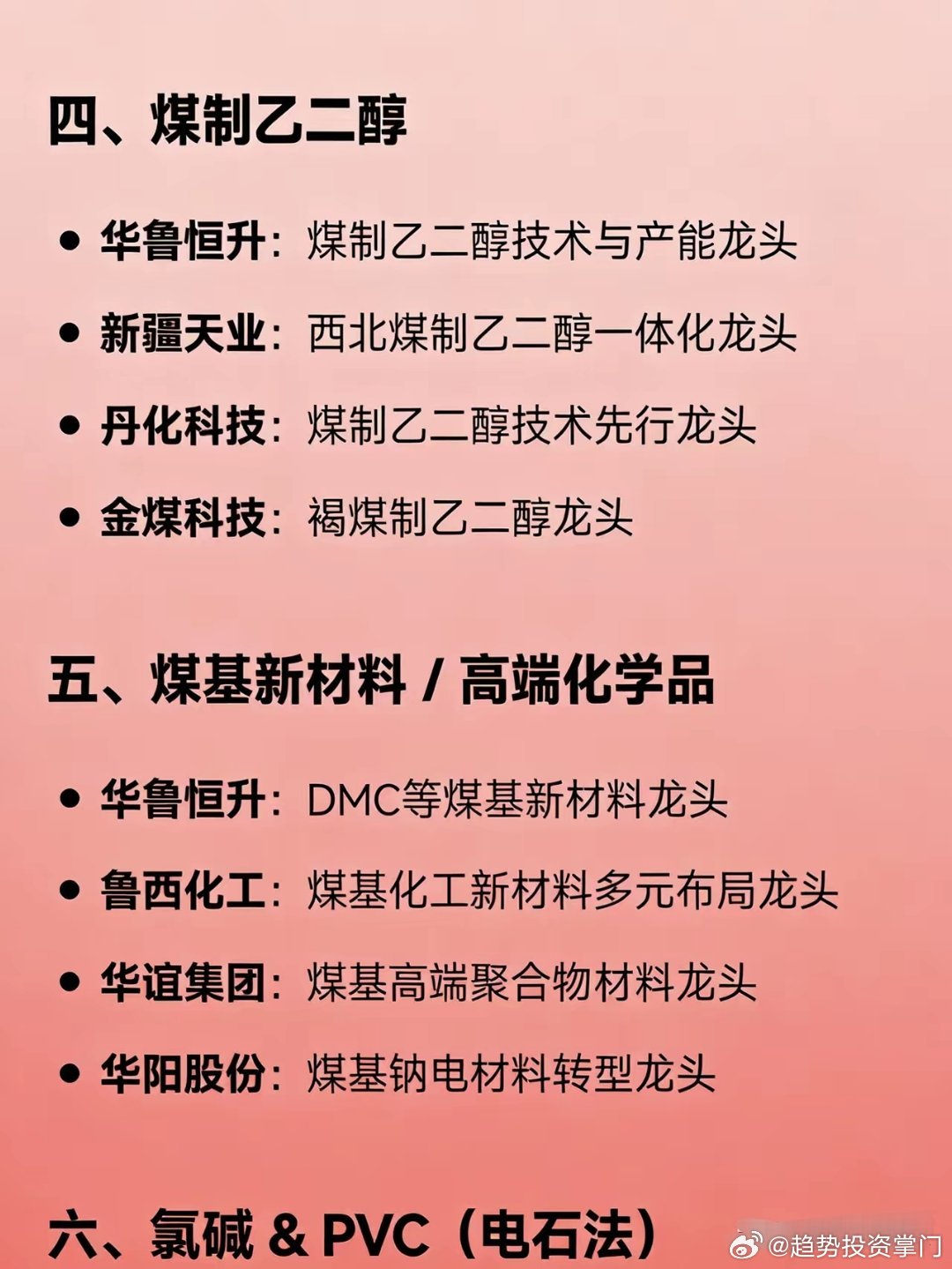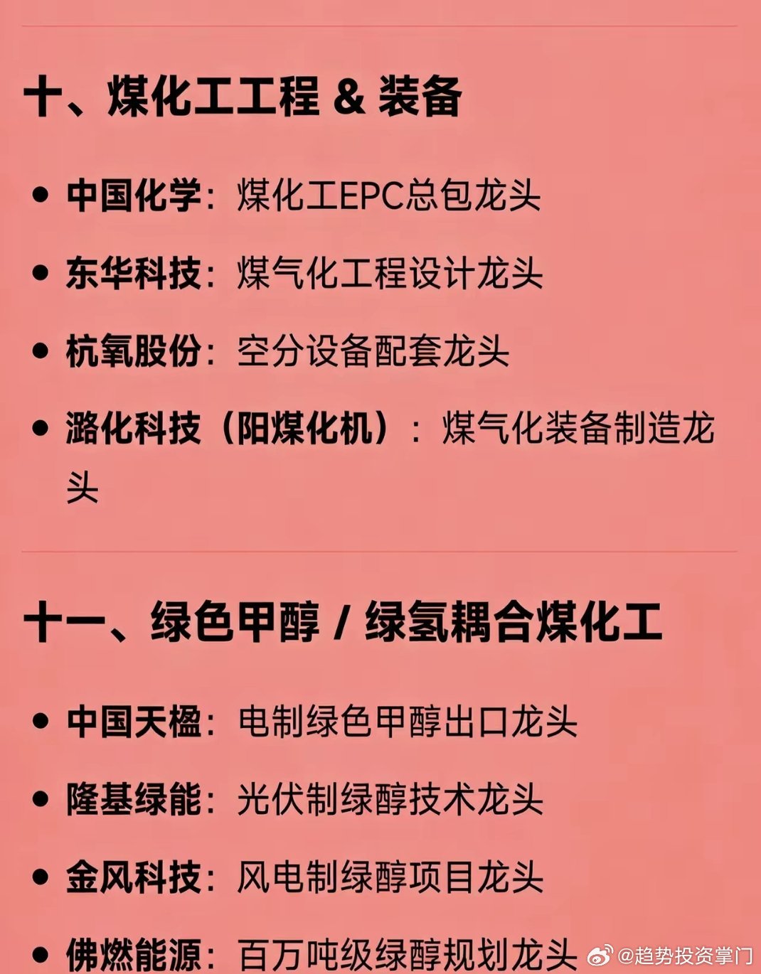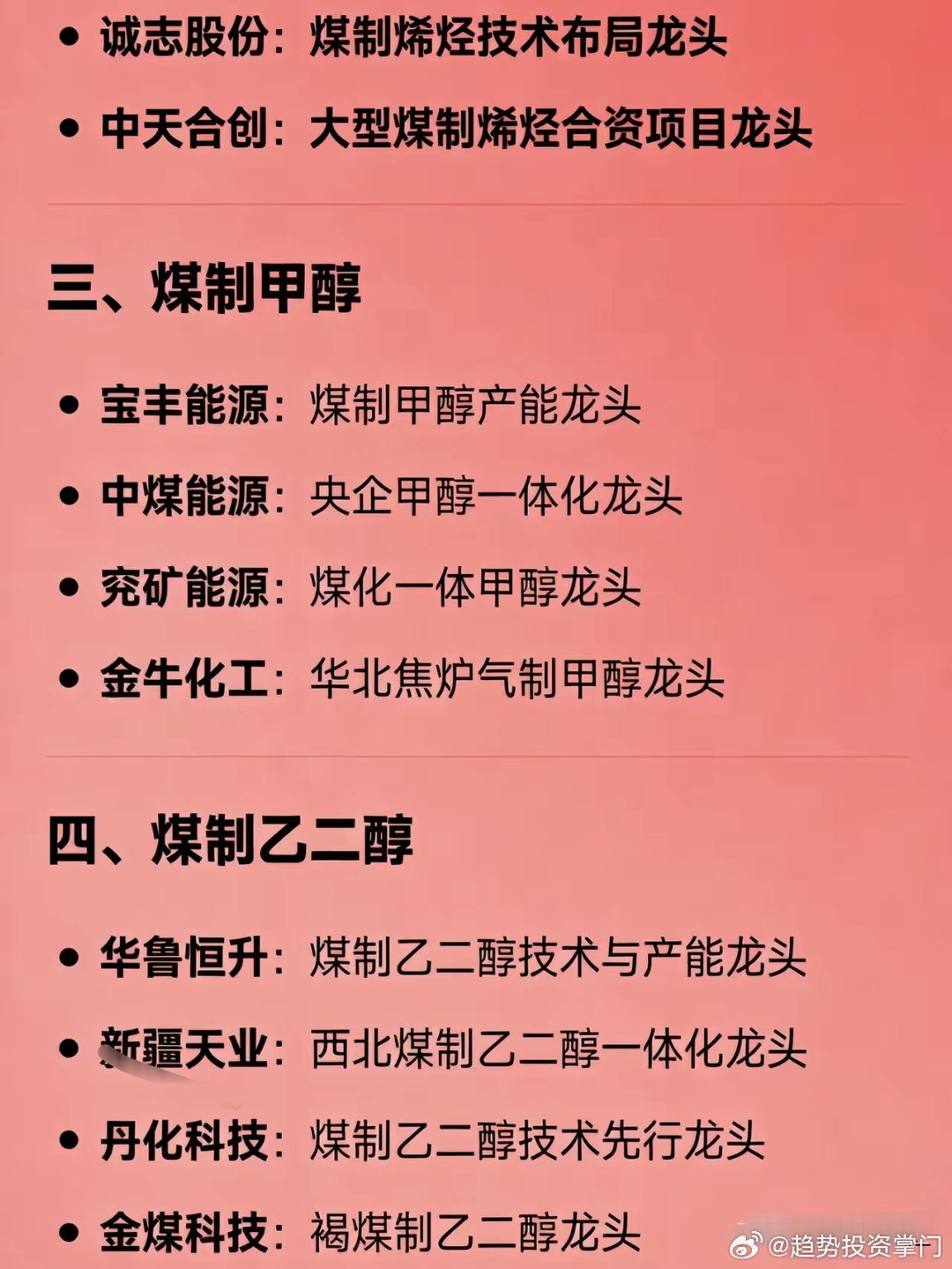 煤化工细分龙头汇总(原创精简)一、综合龙头- 中国神华:煤电化运一体化龙头- 中煤能源:央企煤化工平台龙头- 兖矿能源:高端煤化工+海外资源龙头- 宝丰能源:煤制烯烃规模成本龙头- 华鲁恒升:煤气化多联产柔性龙头二、煤制烯烃- 宝丰能源:产能一体化龙头- 诚志股份:技术布局龙头- 中天合创:大型合资项目龙头三、煤制甲醇- 宝丰能源:产能龙头- 中煤能源:央企一体化龙头- 兖矿能源:煤化一体龙头- 金牛化工:华北焦炉气制甲醇龙头四、煤制乙二醇- 华鲁恒升:技术产能龙头- 新疆天业:西北一体化龙头- 丹化科技:技术先行龙头- 金煤科技:褐煤制乙二醇龙头五、煤基新材料- 华鲁恒升:DMC等新材料龙头- 鲁西化工:多元布局龙头- 华谊集团:高端聚合物龙头- 华阳股份:煤基钠电转型龙头六、氯碱 & PVC- 中泰化学:产能一体化龙头- 新疆天业:循环经济龙头- 君正集团:闭环成本龙头- 北元集团:区域龙头七、尿素 & 合成氨- 华鲁恒升:煤头尿素成本龙头- 华昌化工:氨-醇协同龙头- 心连心:高效尿素龙头- 云图控股:尿素+复合肥龙头八、PVA/BDO/可降解- 皖维高新:PVA全产业链龙头- 双欣材料:PVA应用龙头- 长城能化:BDO-PTMEG煤基龙头九、焦化副产利用- 陕西黑猫:煤-焦-化循环龙头- 安泰集团:副产深加工龙头- 兴化股份:氨-醇-乙醇龙头十、工程 & 装备- 中国化学:EPC总包龙头- 东华科技:气化工程设计龙头- 杭氧股份:空分设备龙头- 潞化科技:气化装备龙头十一、绿醇/绿氢耦合- 中国天楹:电制绿醇出口龙头- 隆基绿能:光伏制绿醇龙头- 金风科技:风电制绿醇龙头- 佛燃能源:百万吨级绿醇龙头⚠️免责声明:内容仅供参考,不构成投资建议。