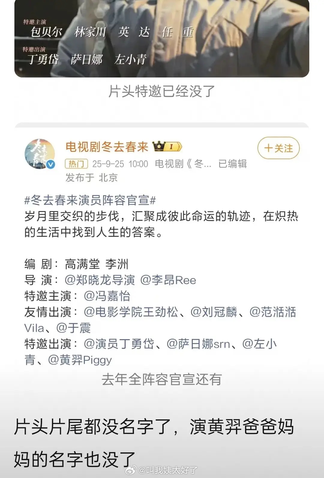 才发现黄羿《冬去春来》戏份全被删了,连演她爸妈的演员名字也没了,发生了什么?