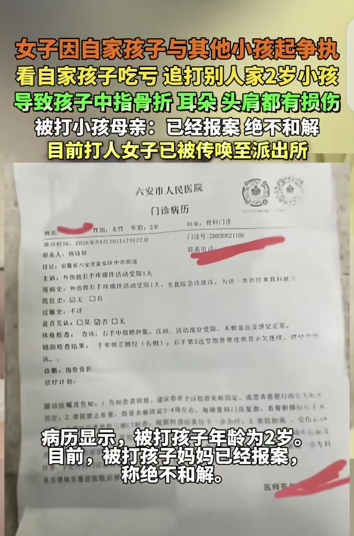 “这个女人太狠了!”安徽六安,一女子带着不到2岁的孩子下馆子,她孩子跟别人家2岁孩子抢玩具吃了亏,女子竟像头发怒的狮子,追着那个孩子拳打脚踢,给自己娃出气,导致孩子中指骨折,耳膜出血,头皮,右肩都受伤,被打孩子母亲:我家宝宝,是我保胎10个月,足足在床上躺1年生下的,我都不舍得打一下,报警,绝不和解。   近日,安徽六安一家饭店内发生的一起暴力事件,引发了全网的愤怒与热议。   一名两岁幼童被一名成年女子拳打脚踢,浑身是伤,经医院检查确诊为右手中指骨折、耳膜出血,头皮和右肩等多处出现软组织挫伤红肿,而这一切的起因,仅仅是两个不到三岁的孩子争抢玩具产生的小摩擦。   这样的暴行,不仅伤害了无辜的幼童,更触碰了所有人的底线,让人无比愤慨。   被打的幼童,是饭店老板夫妇的孩子,这个孩子来得十分不易,是孩子的母亲保胎十个月,又足足在床上躺了一年才艰难生下的,平日里,全家人都把这个孩子当成掌上明珠,连一句重话都舍不得说,更别说动手打骂。   可谁也没想到,这样一个被精心呵护的宝贝,却在自家的饭店里,遭到了如此残忍的对待。   面对孩子满身的伤痕,孩子的母亲悲痛欲绝,当场明确表示,一定要报警,绝不与施暴者和解,这份决绝,藏着一个母亲最深的痛苦与愤怒,换做任何一个家长,恐怕都无法接受自己的孩子遭受这样的伤害。   事情发生在3月19日中午,当时,饭店老板夫妇正在店里忙碌,他们两岁的女儿就在店内玩耍,手中拿着自己心爱的玩具车。   就在这时,一名穿着灰衣服的女子带着自己的孩子走进饭店用餐,两个年龄相仿的孩子很快就凑到了一起。   起初,两个孩子相处得还算平和,可没过多久,灰衣女子的孩子就看中了店家孩子手中的玩具车,伸手就去抢夺。   店家的孩子本能地护住自己的玩具,争抢过程中,不小心抓到了灰衣女子的孩子,对方孩子随即哭了起来。   这本是孩童之间再寻常不过的小摩擦,每个家长都可能遇到,正常情况下,家长要么安慰自家孩子,要么引导两个孩子友好相处,可灰衣女子的反应,却让人瞠目结舌。   看到自家孩子哭泣,灰衣女子瞬间情绪失控,像一头被激怒的狮子,完全失去了成年人应有的理智和克制。   她没有丝毫犹豫,径直冲向店家的两岁幼童,先是对着孩子大声训斥,随后更是追着孩子跑到收银台,蹲下身就对孩子动手。   她的动作幅度极大,下手凶狠,拳头不断落在孩子的手、身体和脸上,脚也不停对着孩子幼小的身躯踢去,整个施暴过程持续了十多秒。   饭店里原本热闹的氛围,被这突如其来的暴力打破,周围的顾客都被眼前的一幕惊得目瞪口呆。   饭店的服务员和阿姨看到后,赶紧上前劝阻,可失去理智的灰衣女子根本不听,依旧我行我素,直到饭店老板夫妇赶到,才强行将她拉开,这场令人发指的暴行才得以停止。   被打的幼童吓得浑身发抖,蜷缩在一旁,哭声越来越弱,小小的身体上布满了红肿的痕迹,让人看着心疼不已。   饭店老板夫妇见状,立刻抱着孩子赶往医院检查,检查结果让夫妻俩心如刀绞,孩子的伤势比想象中还要严重,右手中指骨折,耳膜出血,多处软组织挫伤,医生当场给孩子上了夹板,看着孩子痛苦的模样,夫妻俩悲痛万分。   施暴结束后,灰衣女子不仅没有丝毫愧疚,反而理直气壮地声称,自己动手是为了给自家孩子出气,全程没有说一句道歉的话。   被警方传唤到派出所后,她依旧毫无悔意,认为只是孩子之间的小事,根本不值一提。   更令人气愤的是,她还召集了一大家子亲友,跑到饭店闹事,试图用1000元钱私了此事,这种嚣张的态度,无疑是在受害家庭的伤口上撒盐。   实在无法理解,一个成年人,怎么能对一个两岁的幼童下如此重的手。   孩童之间的小摩擦,本就无关紧要,作为家长,理应做好引导,而不是用暴力去报复一个毫无反抗能力的孩子。   这个被打的孩子,是母亲拼尽全力才生下的宝贝,是全家人的希望,施暴者的一拳一脚,不仅打在孩子的身上,更痛在整个家庭的心里。   目前,警方已经介入调查,固定了相关证据,孩子的伤情司法鉴定也在有序推进中。   饭店老板娘将监控视频发布到网络上后,引发了大量网友的关注和谴责,大家纷纷支持饭店老板夫妇的决定,呼吁法律严惩施暴者,让她为自己的冲动和暴行付出应有的代价。   无论最终的处理结果如何,这个两岁的幼童所遭受的身体和心理伤害,都难以轻易抹去。   希望这件事能给所有家长敲响警钟,护犊子没有错,但不能突破法律和道德的底线,更不能将自己的情绪,发泄在无辜的孩子身上。   如果各位看官老爷们已经选择阅读了此文,麻烦您点一下关注,既方便您进行讨论和分享,又能给带来不一样的参与感,感谢各位看官老爷们的支持!