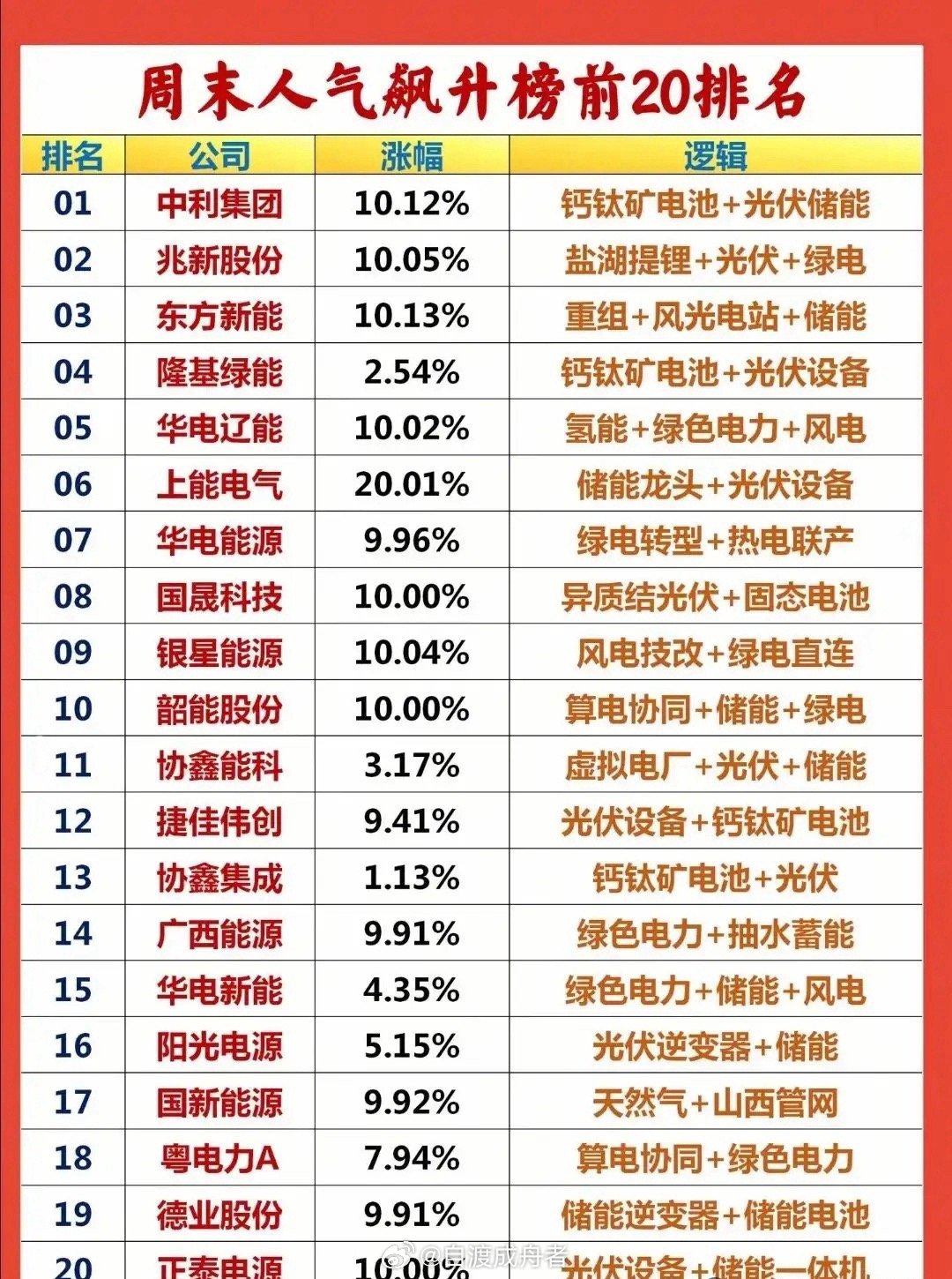 周末人气股多为周五涨停股,集中在光伏、电力、储能等相关领域。中利集团排名靠前,此