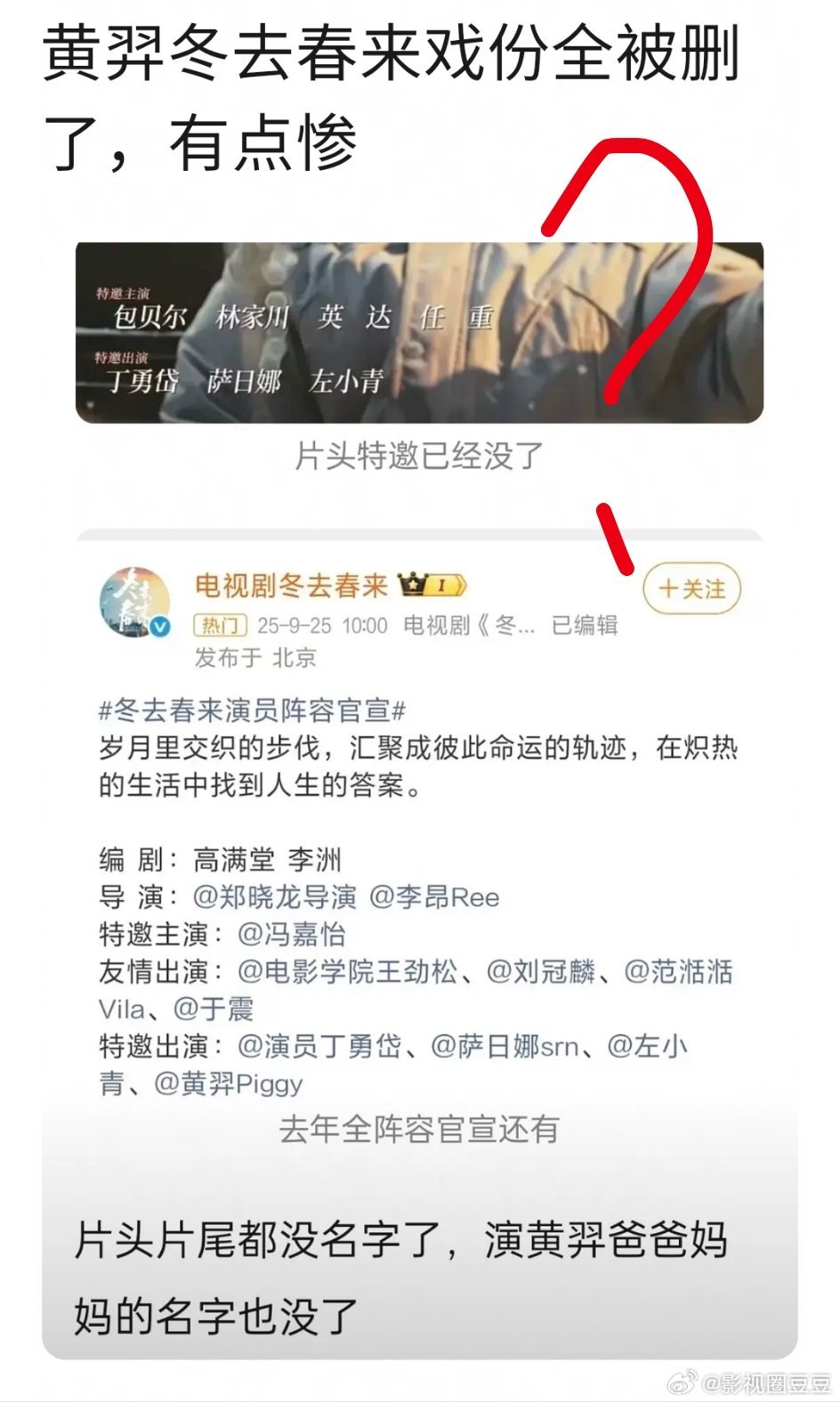 冬去春来黄羿角色疑似被删 啊?为什么?黄羿还正在拍新剧《归鸾》,没道理啊