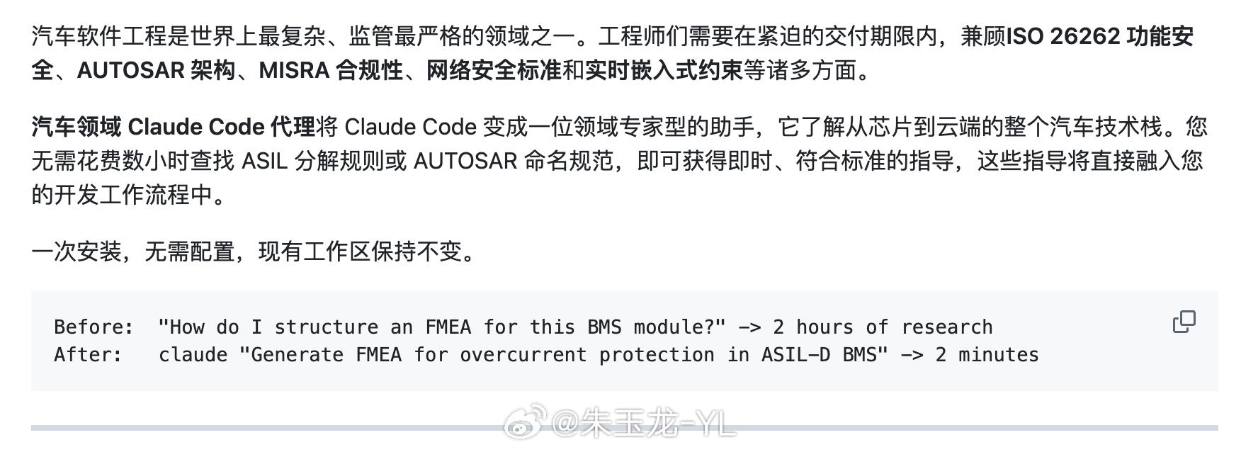 汽车领域 Claude Code 代理将 Claude Code 变成一位领域专家型的助手,它了解从芯片到云端的整个汽车技术栈。您无需花费数小时查找 ASIL 分解规则或 AUTOSAR 命名规范,即可获得即时、符合标准的指导,这些指导将直接融入您的开发工作流程中。