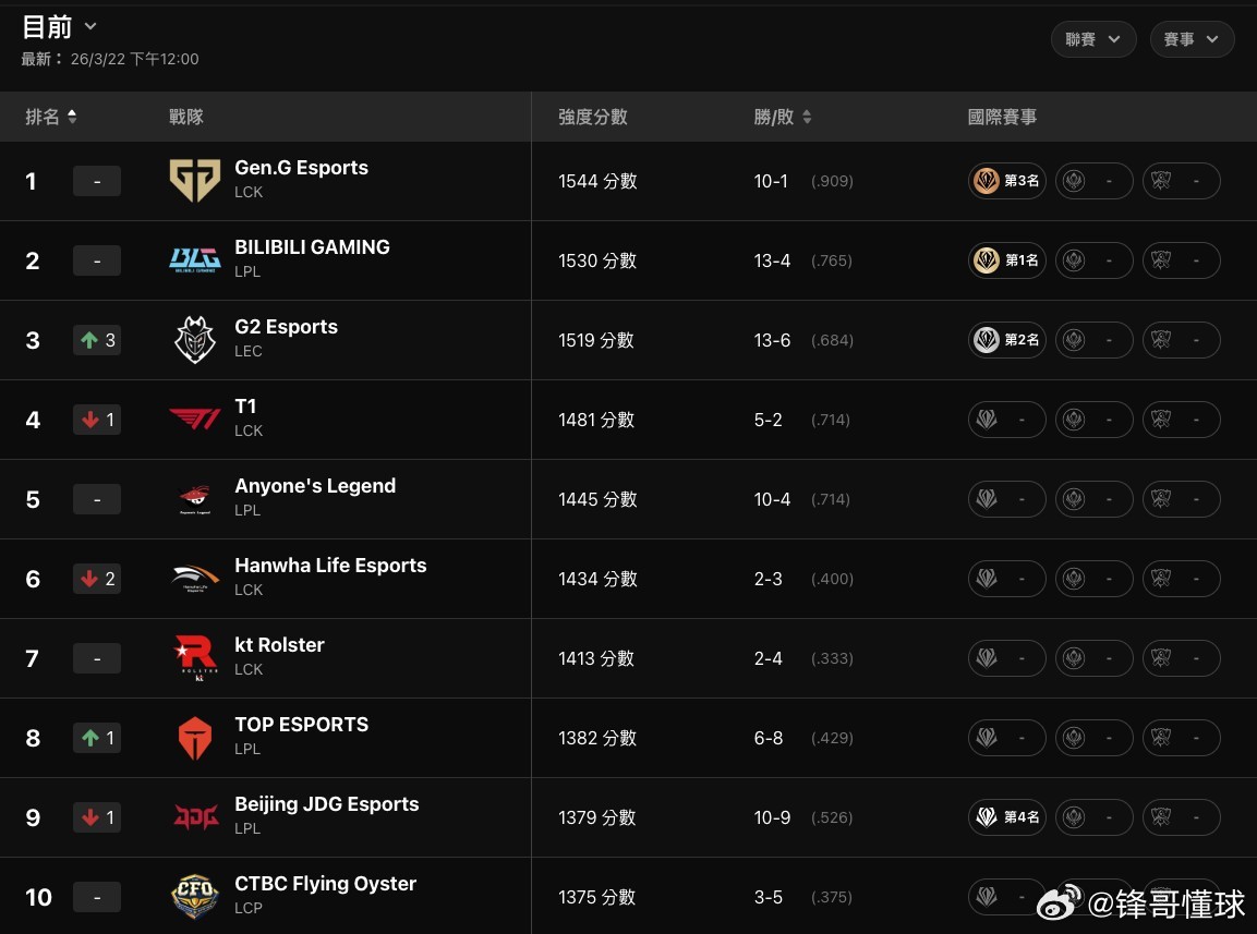 两支没有来参加先锋赛的LCK战队均有名次下滑,其中T1下降1名来到第四,HLE下降2名来到第6。JDG在先锋赛先后遭遇GEN和BLG横扫,排名下降一名来到第9。
