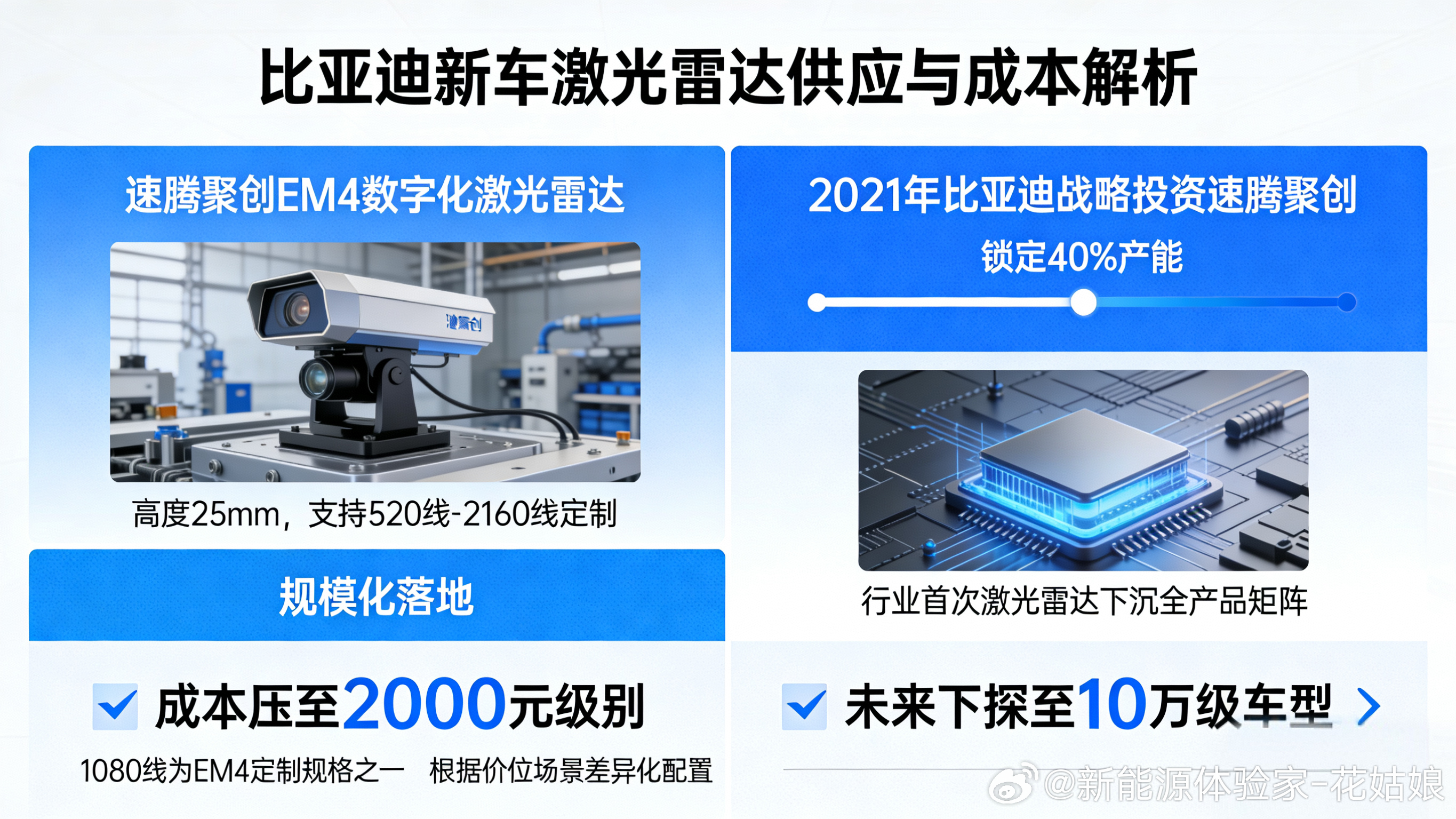 比亚迪多款新车的激光雷达由速腾聚创独供,采用其已量产的EM4数字化激光雷达,支持520线至2160线的定制化方案,高度仅25mm,可完美融入车身设计。