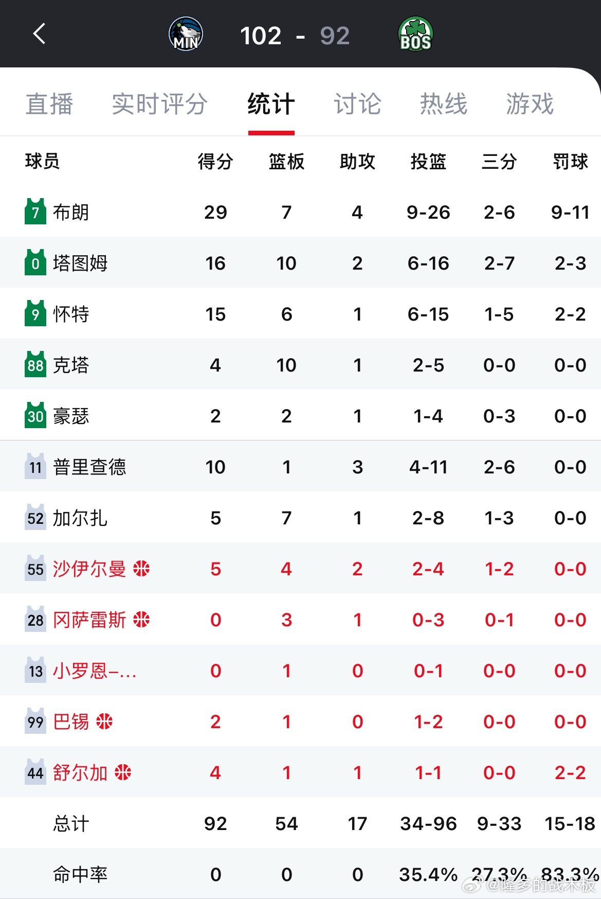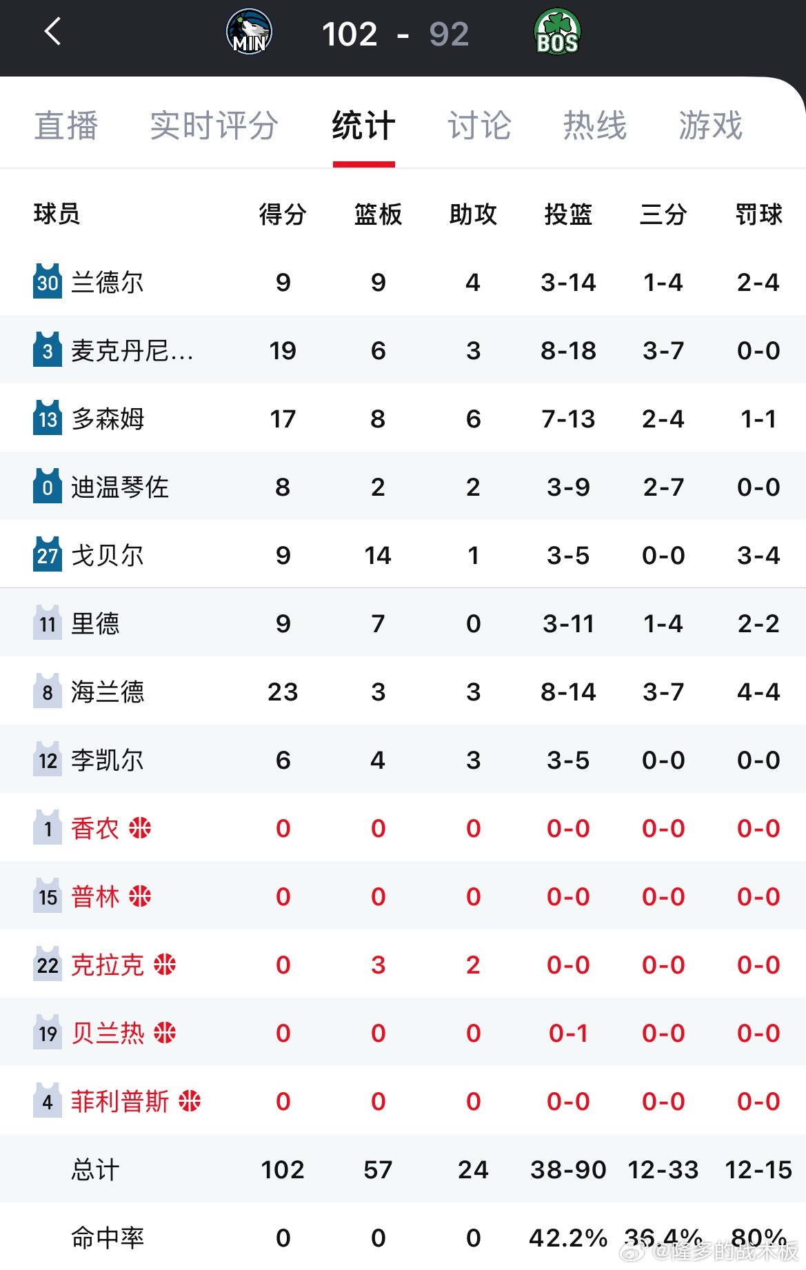 森林狼客场102-92力克凯尔特人!这是自2005年以来,森林狼首次在北岸花园赢球,此前已连续21年不胜🤯