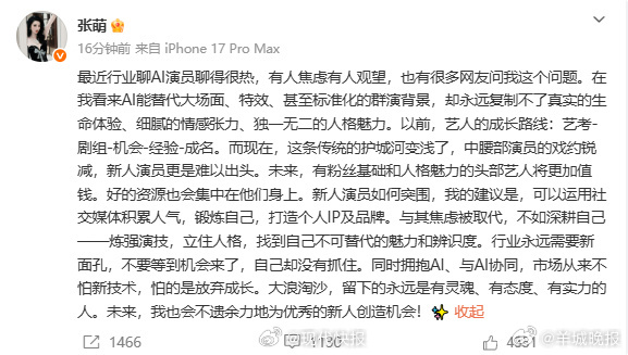 【#张萌回应AI演员争议#】#张萌称头部艺人将更值钱#3月23日,发文谈AI演员热潮,直言AI无法替代真实情感与人格魅力。她认为AI冲击下中腰部演员压力增大,头部艺人价值将进一步凸显,并建议新人打造个人IP、拥抱AI协同,深耕实力与辨识度。(现代快报)更多消息:#时代少年团 跑男##玉簟秋官宣杀青##栗米摇改田栩宁进行曲或侵犯姓名权##郑合惠子正在拍摄将门独后##侮辱虞书欣黑粉致歉##梓渝手机壳原图#(编辑:惠天骄;审签:艾渝)