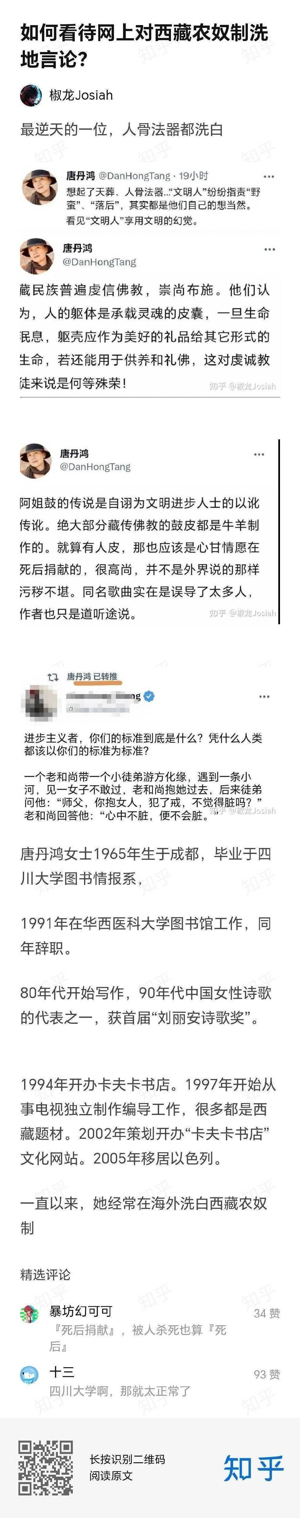 知名作家唐丹鸿(已经移居以色列)公开给美国炸死伊朗学校160个女生洗白。 此前,她也爆出歌颂西藏农奴制的种种言论,甚至说做人骨法器是“殊荣”。 这样的人, 国内还有她的书出版。