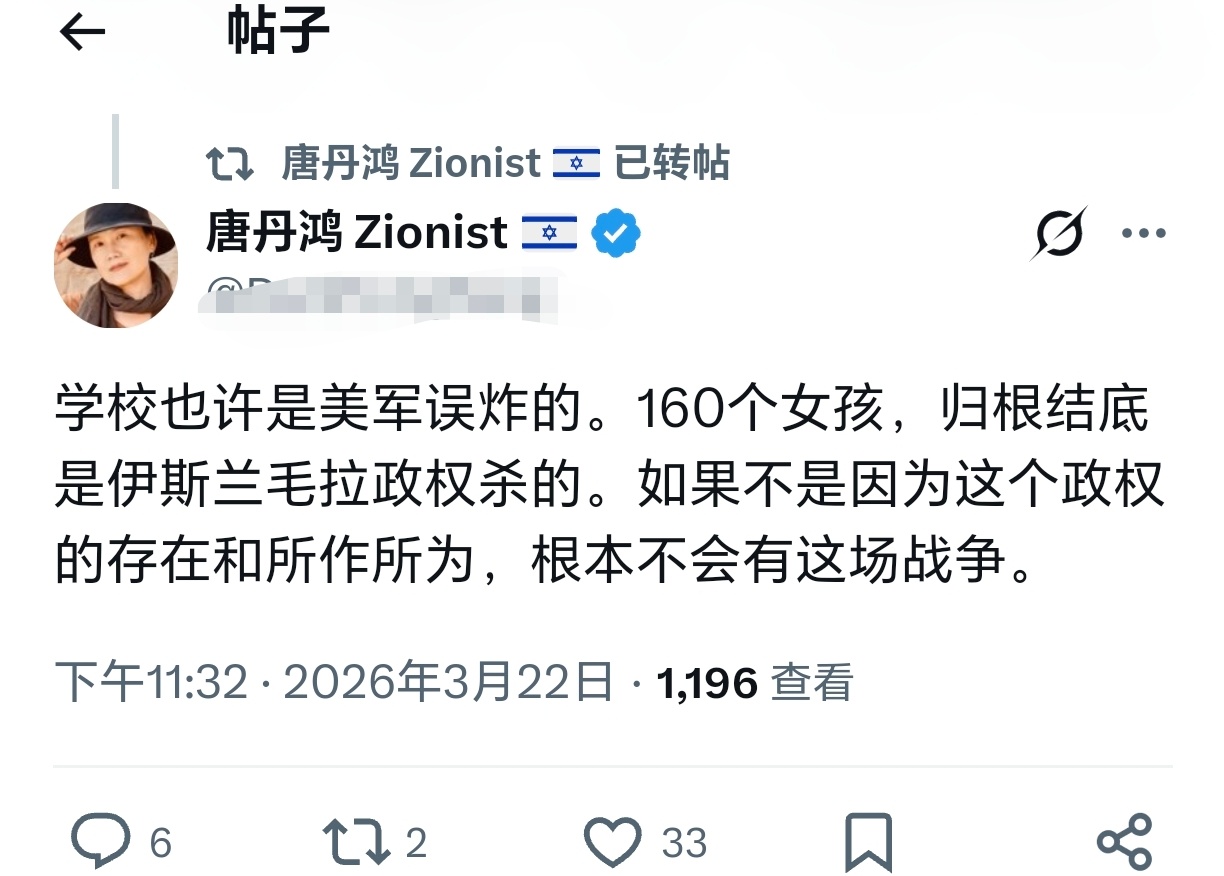 知名作家唐丹鸿(已经移居以色列)公开给美国炸死伊朗学校160个女生洗白。 此前,