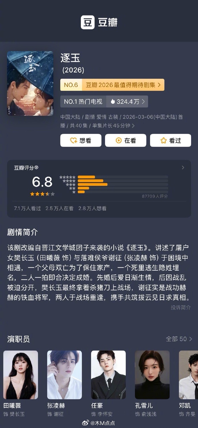 张凌赫、田曦薇 逐玉豆瓣开分6.8,8.7万人打分,以三、四星评分居多。打分人数这么少?逐玉豆瓣6.8