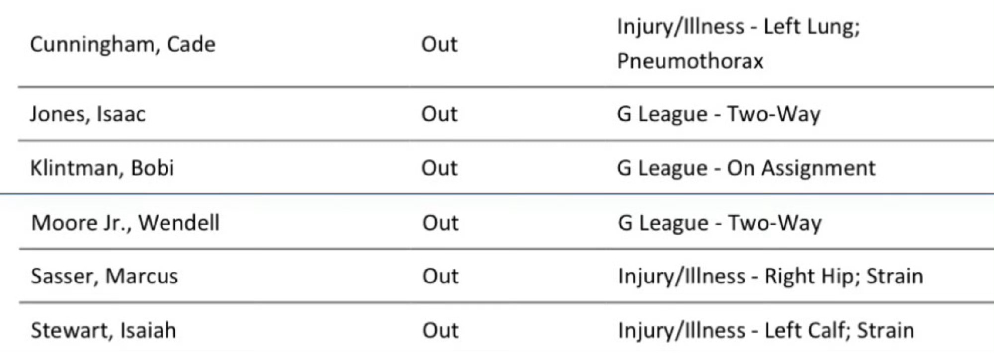【伤病情况】八村垒(右小腿酸痛)、斯玛特(右脚踝酸痛)、克勒贝尔(腹肌拉伤)均出战成疑。坎宁安(气胸)、萨塞尔(右臀拉伤)、斯图尔特(左小腿拉伤) 等6人缺阵。