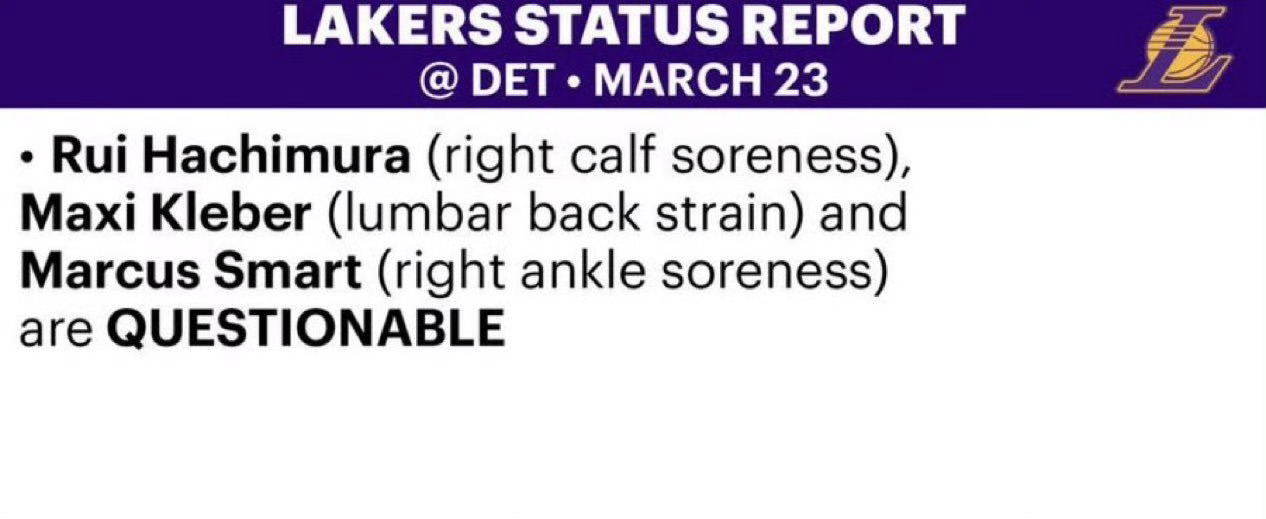 【预测首发】湖人:东契奇、斯玛特、里夫斯、詹姆斯、艾顿活塞:詹金斯、罗宾逊、奥萨尔、哈里斯、杜伦