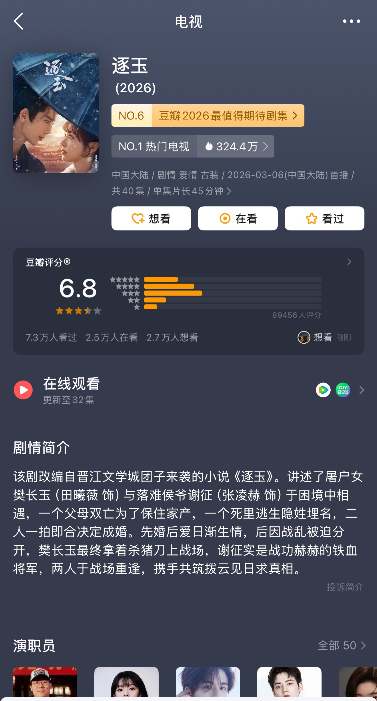 张凌赫和田曦薇的《逐玉》开分6.8,打分8.9万多人,这个分是高了还是低了,客观
