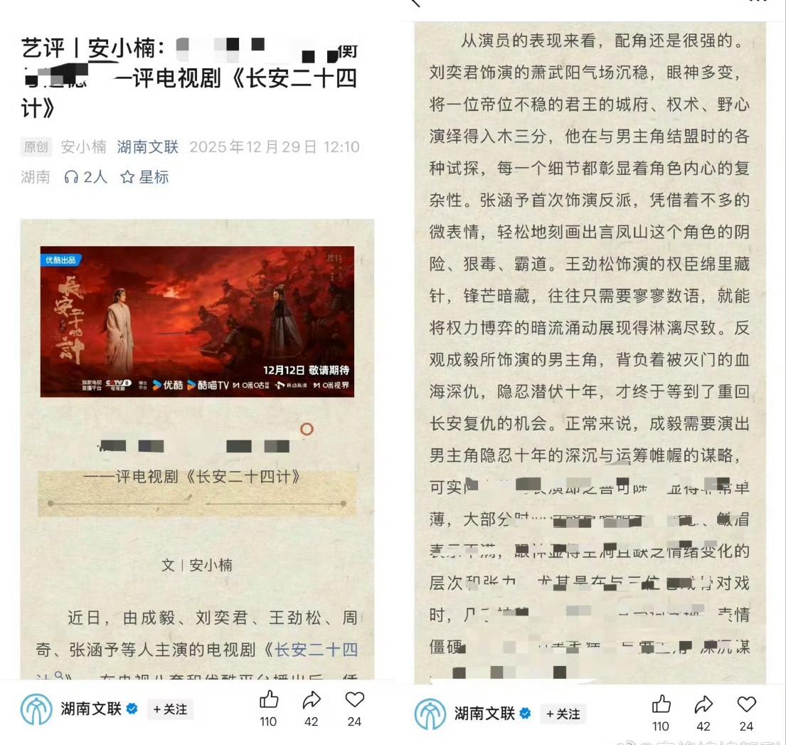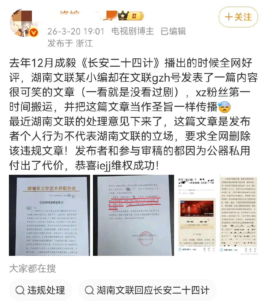 关于《长安二十四计》遭湖南文联“个人”抹黑一事,维权结果通报来了!去年12月,成毅主演的《长安二十四计》播出期间,湖南文联公众号曾出现一篇明显未看过剧的“锐评”。该文被某家粉丝大量恶意搬运诋毁,给剧集带来了困扰。 近日,经官方调查处理,结果已出:该文章纯属发布者个人行为,不代表湖南省文联立场。 涉事编辑及审稿人因“公器私用”受到处分,文章已被全网责令删除,发布者亦已离职处理。感谢相关部门还事实以真相! 虽然相关人员受到处罚。但对于《长安二十四计》这样一部优秀作品而言,被恶意损害的口碑不该就此被遗忘。 维权不是为了对立,是为了让“公器私用”不再发生。真相或许会迟到,但我们绝不让好剧蒙受不白之冤。欢迎大家抛开偏见,去感受这部真正的国之经典诚意之作。