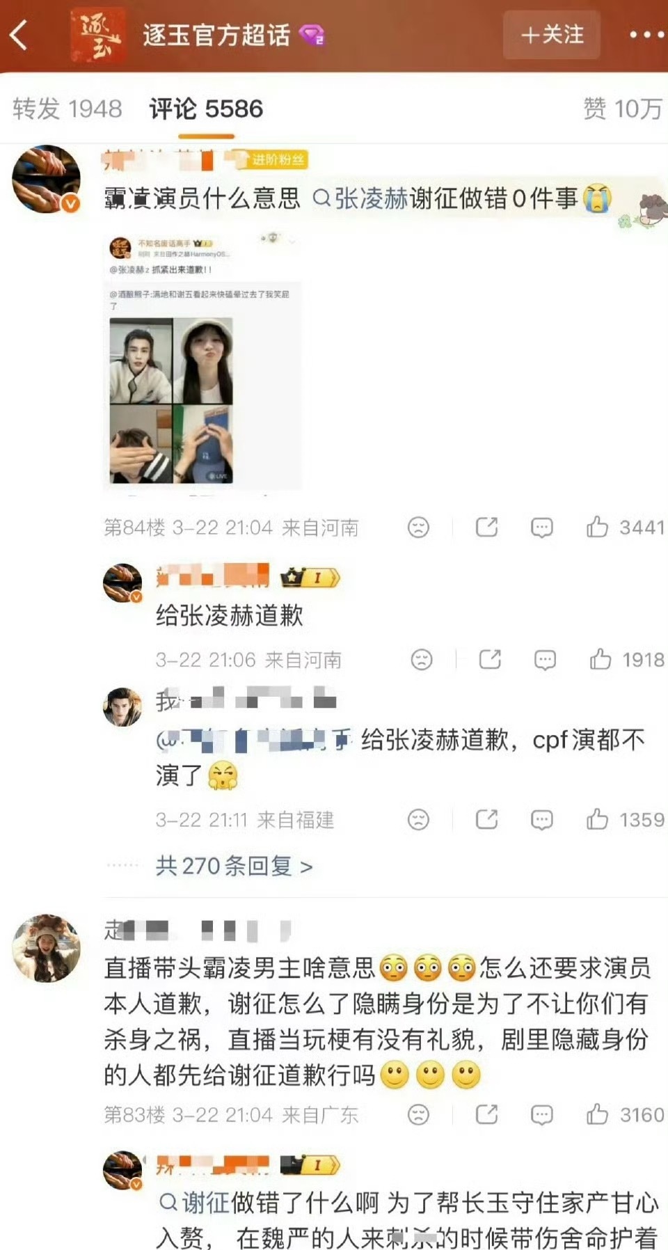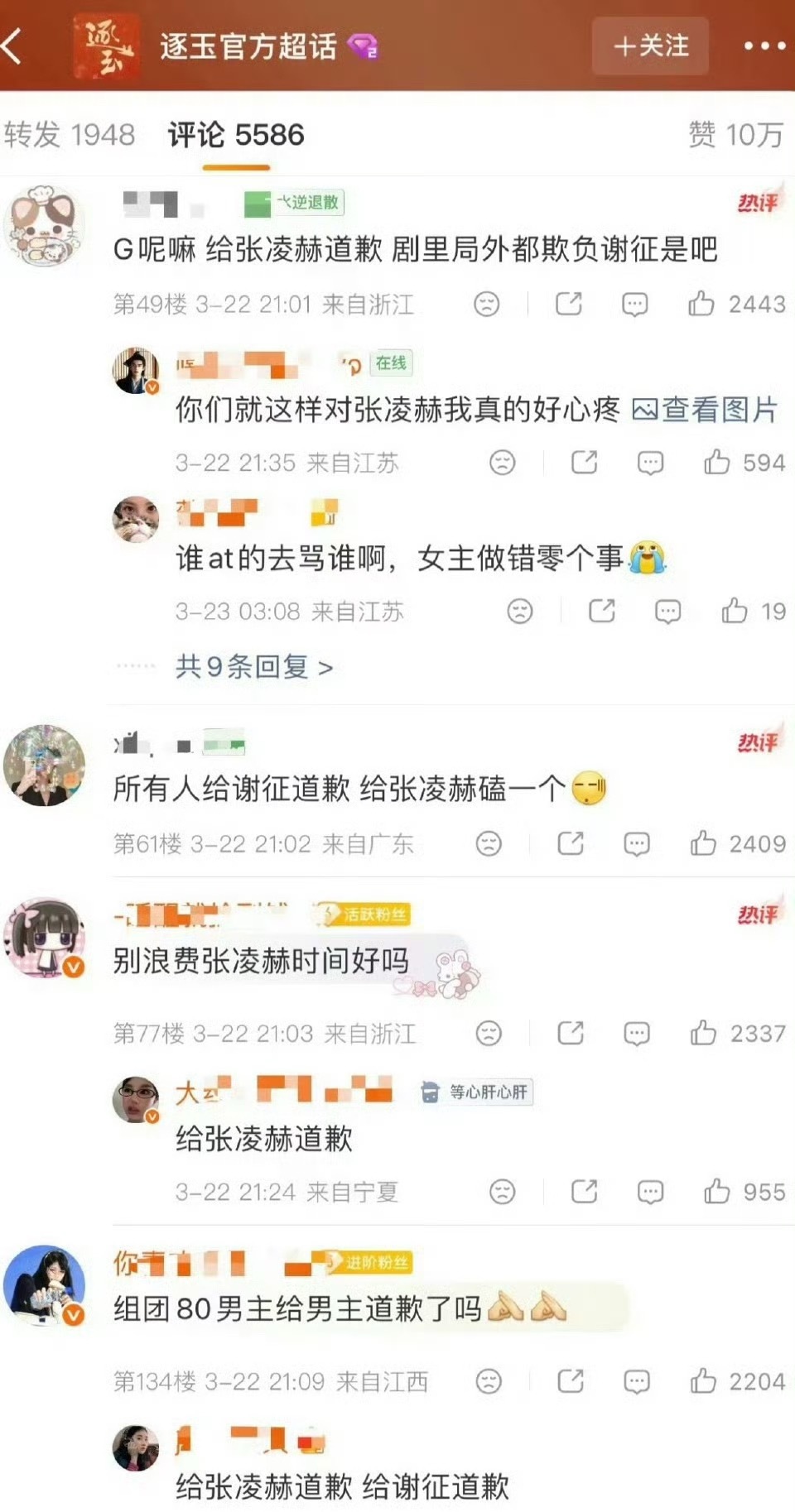 张凌赫粉丝霸占《逐玉》官博评论区前排,喊话让田曦薇和昨天直播的人给张凌赫道歉,粉