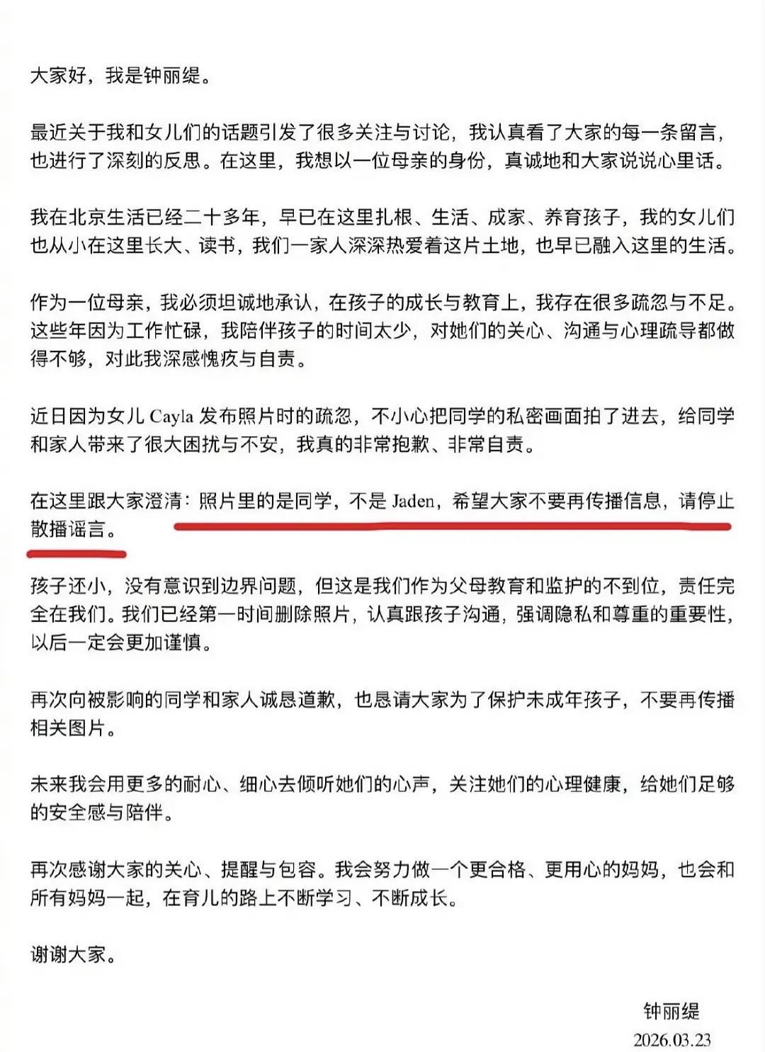 钟丽缇这次出来替女儿道歉,可能是因为她做为母亲都看不下去自己女儿的所作所为了。 钟丽缇小女儿考拉,p图的时候知道给自己遮住点,也不知道给朋友遮一下。 除此之外还有很多事也被曝光,比如考拉的身份认同问题,还有钟丽缇大女儿在内网发 Chinese New Year,在外网发 Lunar New Year,两姐妹也点赞了,疑似文化挪用。 三个女儿都有这样的负面消息,钟丽缇作为母亲确实要多关注,并且进行教育了。