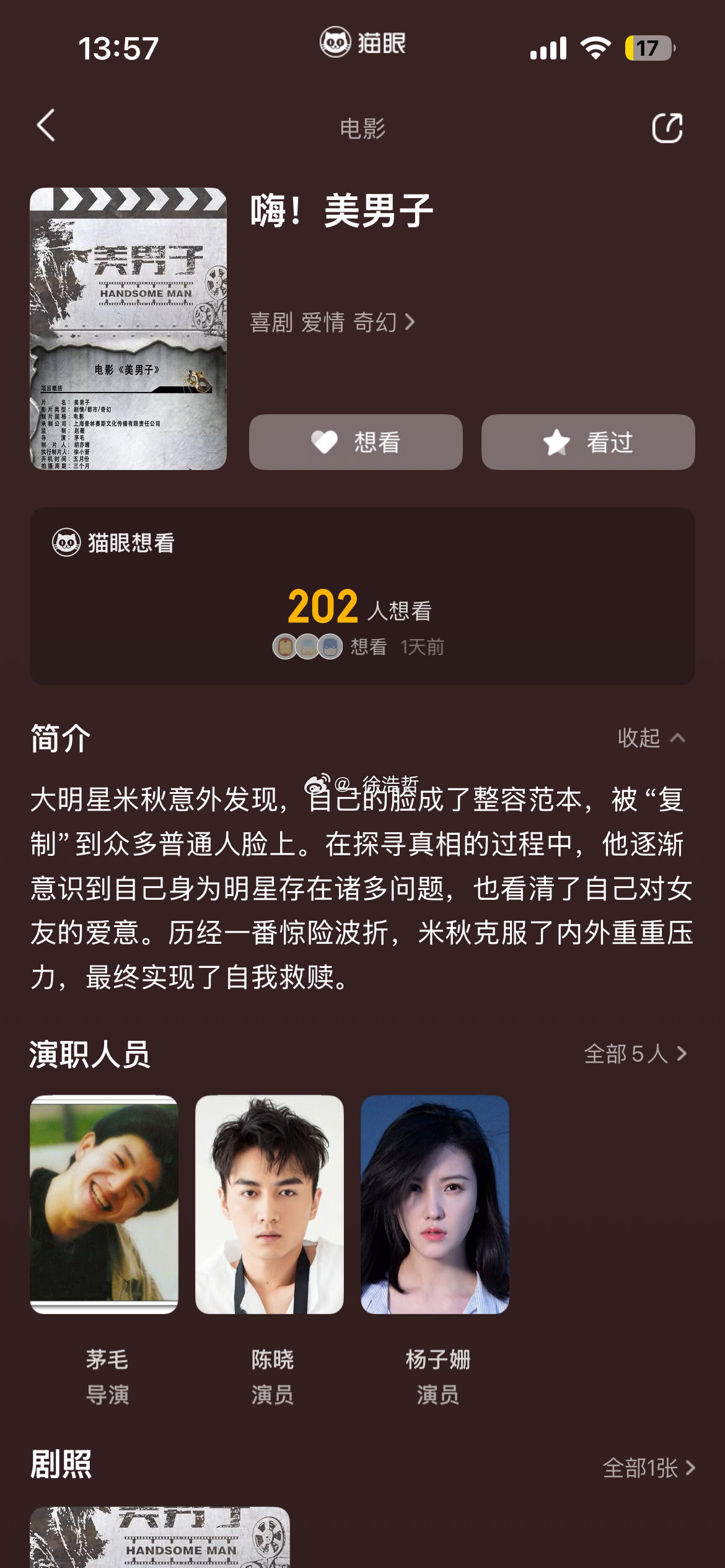 vv姐还有一部是监制(?)的电影叫《一表人才》,之前名字是《嘿!美男子》/《美男子》茅毛导演,张冀编剧,陈晓、杨子姗主演的喜剧、爱情电影(剧情/都市/奇幻)目前已取得公映许可证,麦特影业、华视娱乐、阿里巴巴影业(现 大麦娱乐)出品电影一表人才