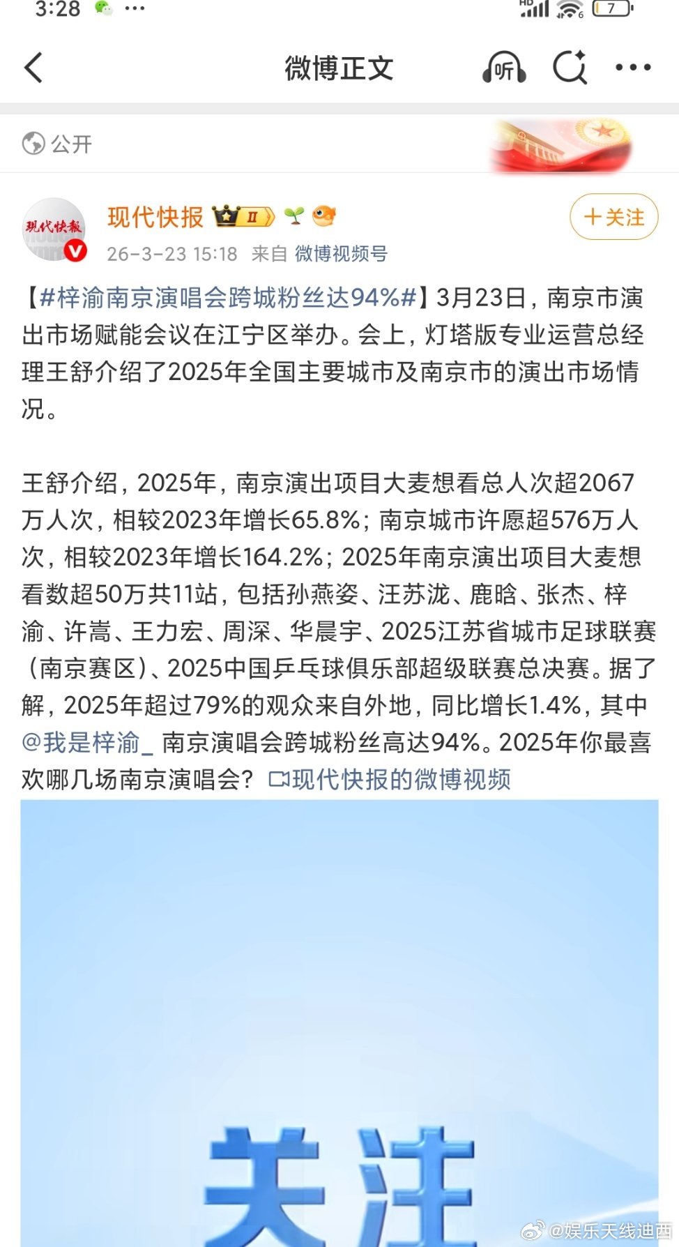 梓渝新专辑新电影新巡演❗划重点:南京市演出市场赋能会议是今天才召开的,就是这个根正苗红,利用艺人正面影响力带动地方文旅经济的梓渝。会议上也特地就梓渝「游点意思」南京演唱会的突出表现表提到了几点:✅跨城粉丝占比94%,为南京演出最高之一;✅大麦想看107.7万创00后艺人单场纪录,强实名入场实现100%上座,全网曝光6.6亿+、热搜400+,以超高人气与跨城号召力,成为南京演艺市场现象级案例。